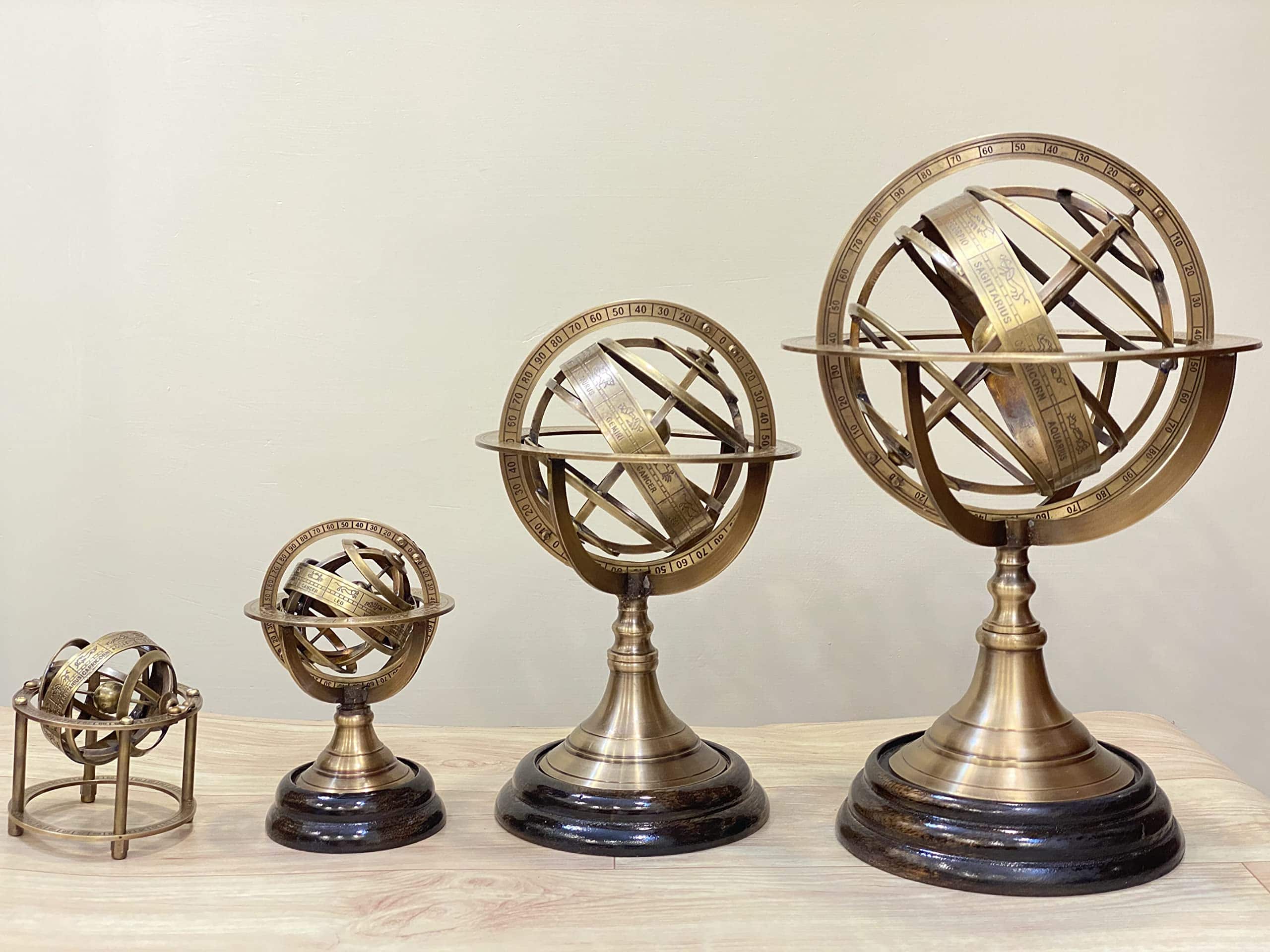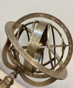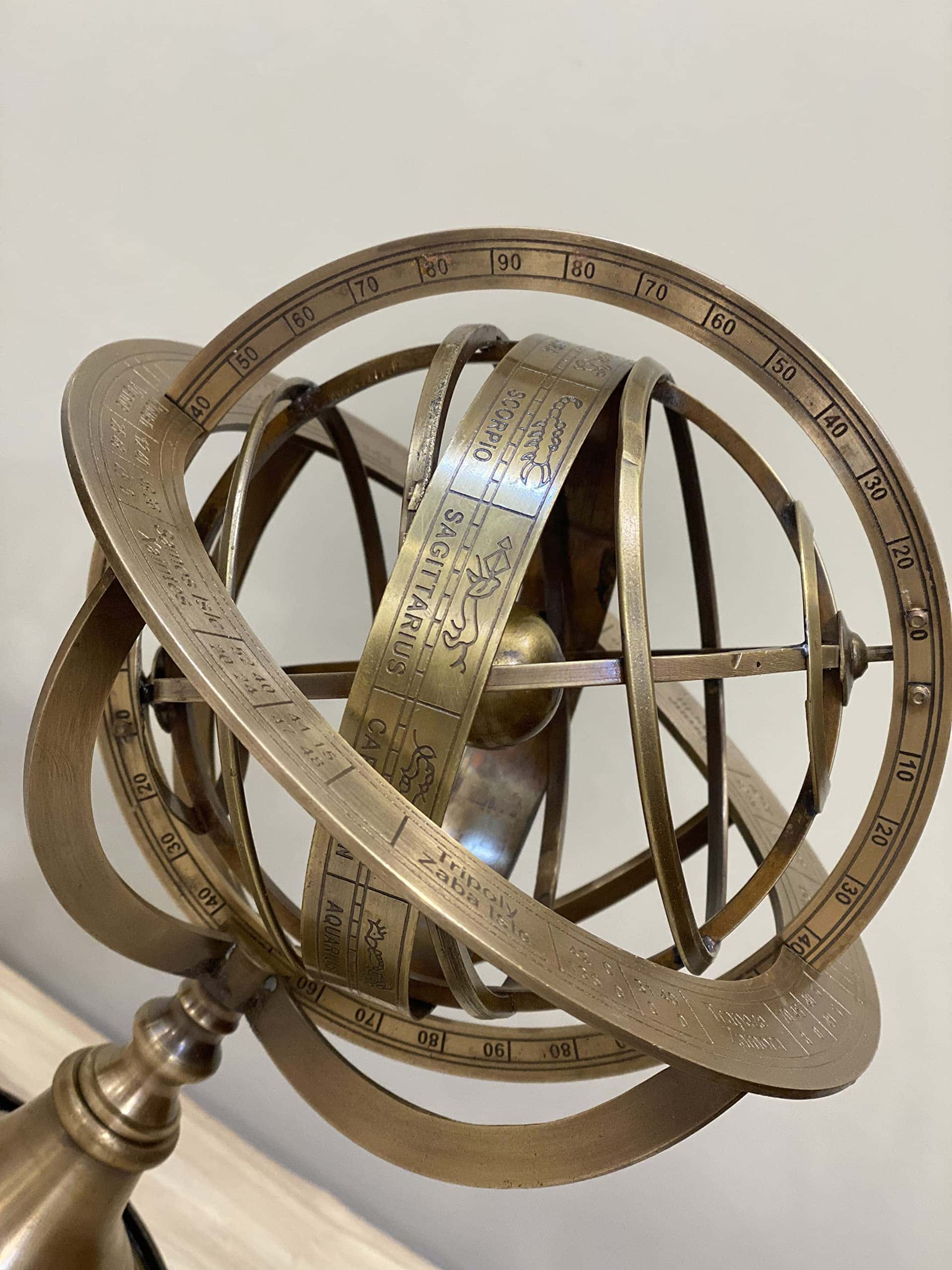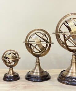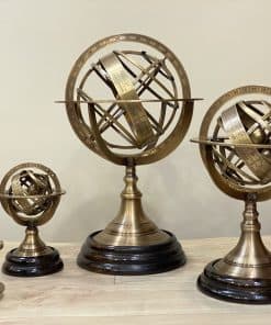 Las Esferas Armilares son una hermosa decoración de mesa con propiedades funcionales realistas. La hermosa esfera armilar totalmente funcional a pesar de ser una decoración para tus mesas y estanterías se ha convertido en un ícono de la ciencia con sus elegantes anillos y preciosas siluetas. Eratóstenes puede haber inventado las esferas armilares alrededor del 255 a.C. Estos instrumentos están compuestos por un conjunto de anillos graduados que representan círculos en la esfera celeste, como el meridiano, ecuador, horizonte eclíptico, trópicos y coluros. Con la ayuda de una esfera armilar, se puede seguir la trayectoria del Sol para cualquier día del año o determinar las coordenadas de una estrella. La Tierra está representada por la esfera de latón situada en el centro de la esfera armilar. Esta elegante reproducción de la Esfera Armilar Europea de Demostración muestra una relación entre las líneas y puntos significativos del cielo. La esfera armilar de latón sólido presenta un acabado de pátina rico que no se empaña ni muestra huellas dactilares al tocarla.