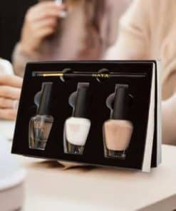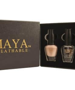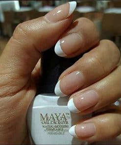 Esmalte de uñas vegano Maya Halal, transpirable y libre de toxinas. Este set incluye esmaltes en tonos rosa, beige y nude, perfectos para lucir una manicura francesa impecable. El pincel facilita la aplicación para lograr un resultado profesional en casa.