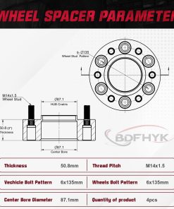Espaciador de rueda BDFHYK de 2 pulgadas/50 mm de grosor, patrón de perno de rueda 6x135mm, diámetro del centro de 87.1mm, paso de rosca M14x1.5. Fabricado con aluminio 6061 de aviación, moldeo integrado CNC, tratamiento de oxidación anódica en la superficie, pernos de clase 10.9. Todos los espaciadores de rueda de BDFHYK certificados por el sistema de calidad IATF 16949:2016. Amplía el espaciado de la rueda para que el vehículo luzca más dinámico y agresivo. Crea más espacio dentro de las ruedas para instalar nuevas suspensiones, frenos y otros accesorios. Mejora el agarre, la estabilidad y el manejo del vehículo durante el proceso de conducción, permitiendo instalar llantas más grandes y anchas. BDFHYK es un fabricante profesional de piezas de automóviles con líneas de industria maduras. Tenemos nuestra fábrica y un experimentado equipo de desarrollo. Hemos servido a diferentes clientes de diversas áreas por más de 10 años. Hacemos nuestro mejor esfuerzo por escuchar a los clientes y actualizar nuestros productos. Si tienes más problemas, no dudes en contactarnos. Elige BDFHYK; elige un buen servicio.
