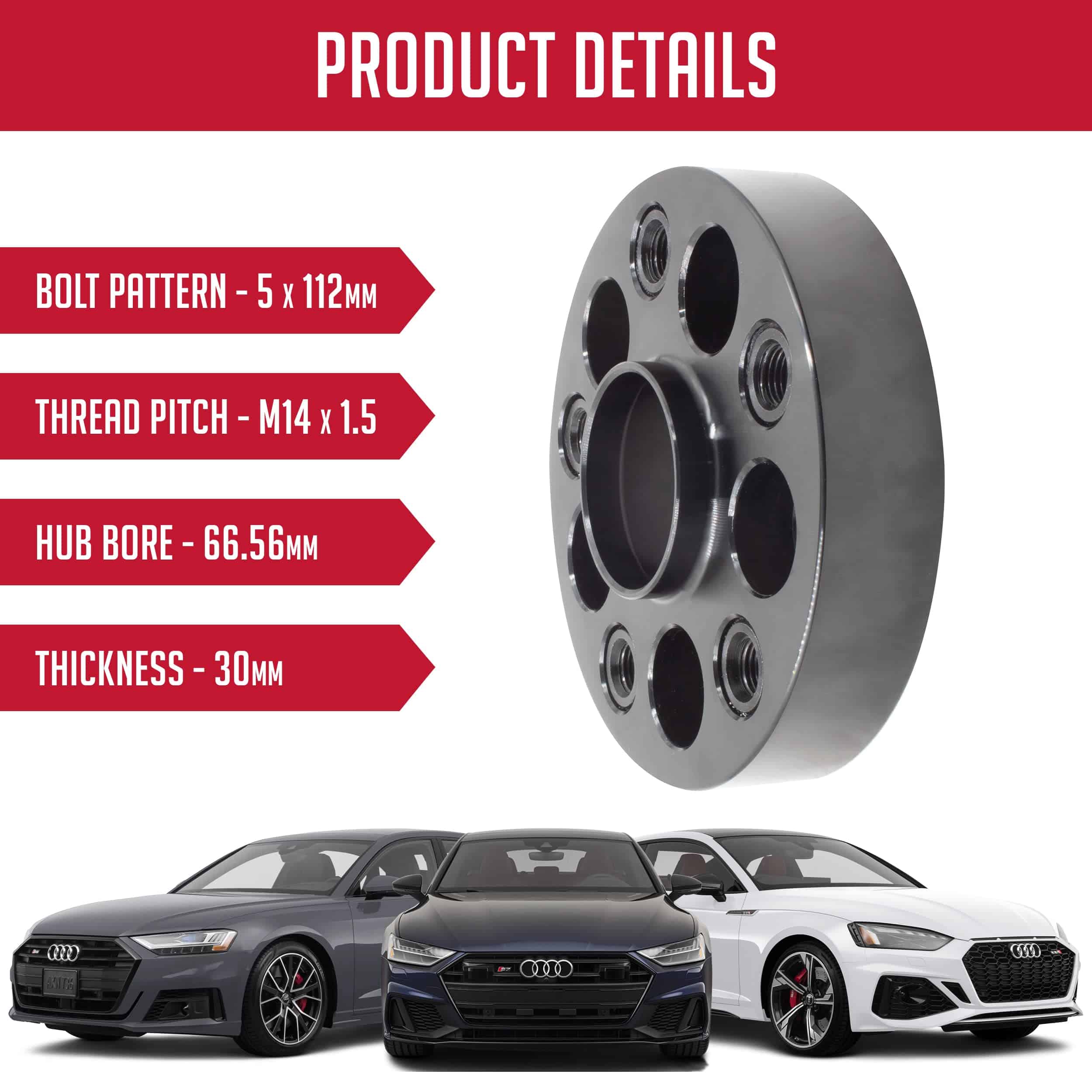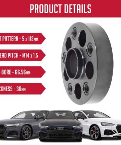 Pieza de alta calidad diseñada para vehículos europeos VW & Audi. Este espaciador de rueda de 30 mm de grosor con patrón de pernos 5 en 112 mm PCD y cubo de 66.56 mm mejora la estética y la funcionalidad de tu vehículo. Se adapta a ruedas de mercado secundario y requiere el uso de pernos acorn. Fabricado en aleación de aluminio 6060-T6 forjado y anodizado negro para mayor resistencia y durabilidad. ¡Obtén el ajuste perfecto y elimina posibles vibraciones en tu vehículo con este kit de espaciador de rueda de alta calidad!