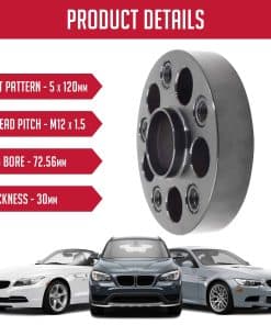 Espaciador de rueda del vehículo europeo centrado en el cubo con pernos negros M12 1.50 de 30 mm de grosor, patrón de pernos de 5 en 120 mm, PCD de 74.10 mm, se adapta a BMW. Nuestros espaciadores mejorarán la apariencia de su vehículo. Solucionan problemas de claridad, crean más espacio para los frenos y cierran brechas en los guardabarros. No es necesario usar pernos más largos como la mayoría de las soluciones de espaciadores europeos. Nuestro diseño único permite usar pernos de longitud OEM estándar. El kit incluye un espaciador de rueda con patrón de pernos 5 en 120 mm – PCD, pernos negros M12 1.50 de asiento cónico de cabeza corta, espaciador al vehículo, pernos de asiento cónico acorn M14x1.5 de la rueda al espaciador. Nuestros espaciadores están hechos de aleación de aluminio 6060-T6 de calidad aeronáutica forjada. Cada espaciador está anodizado en negro, lo que mejora significativamente la dureza y resistencia a la corrosión. Los tornos CNC y las fresadoras garantizan un ajuste preciso en el cubo de su vehículo eliminando posibles vibraciones. Todo el hardware es de grado 10.9 de la SAE.