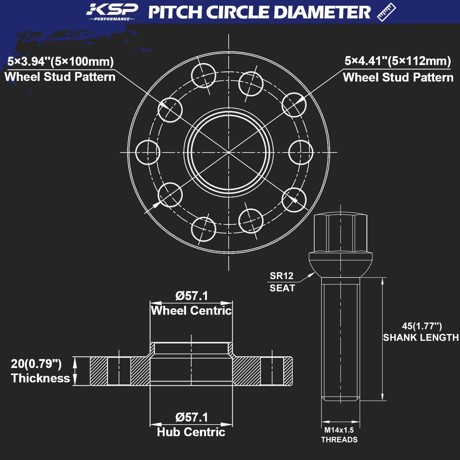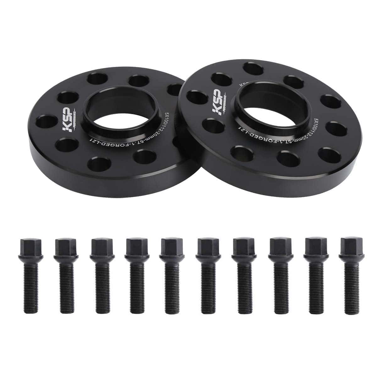 2. Separadores de Rueda Centrados en el Buje con Dos Patrones de Perno: 5×100 a 5×100 y 5×112 (¡Atención: NO CAMBIA EL PATRÓN DE PERNOS!), Buje de 57.1mm NO se ajusta a buje de 66.56mm, Espesor: 20mm, Paso de Rosca: M14x1.5mm, Asiento de Perno: Esfera o Bola, Longitud del Vástago: 45mm. Los pernos de rueda se ajustarán a llantas de fábrica de stock.