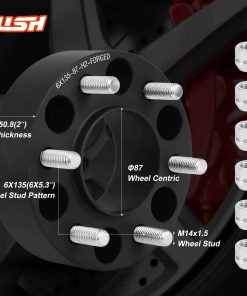 Espaciadores de Rueda 6 Lug 6×135 para Ford F150 Expedition Navigator 2015-2023. Grosor de 2″ (50.8mm), patrón de pernos de vehículo/rueda 6x135mm, centro de buje de 87.1mm con labio, pernos/tuercas roscados de 14-1.5mm. Compatible con F150, Expedition y Navigator 2015-2023. Fabricados en aleación de aluminio 6061-T6, superficie anodizada, capa exterior dura y transparente. Mejora la conducción y tracción del vehículo, aspecto más agresivo. Espaciadores de rueda de anillo central del buje con mínima holgura para evitar vibraciones. Consulte la tabla de compatibilidad y número OEM antes de comprar. Cubiertos por garantía de DEVOLUCIÓN DE 30 DÍAS y garantía de 12 meses. Contáctenos para más información.