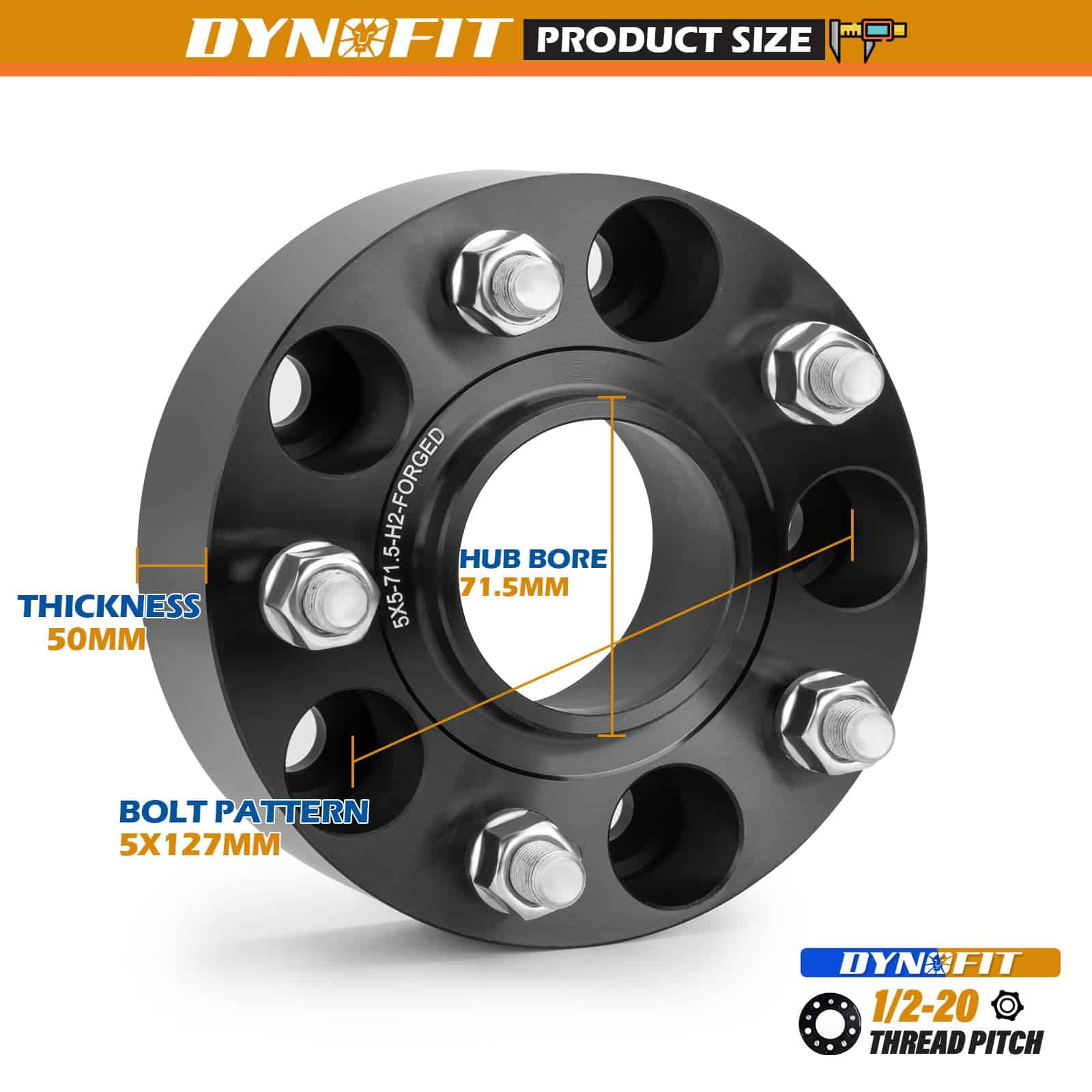 1. Parámetro del Espaciador de Rueda Patrón de rueda (PCD) Patrón de perno del vehículo 5×5″(5x127mm), Diámetro del buje: 71.5mm, Grosor: 2″(50mm), Tornillo de paso: 1/2″-20, Juego de 4 piezas de espaciadores de rueda.