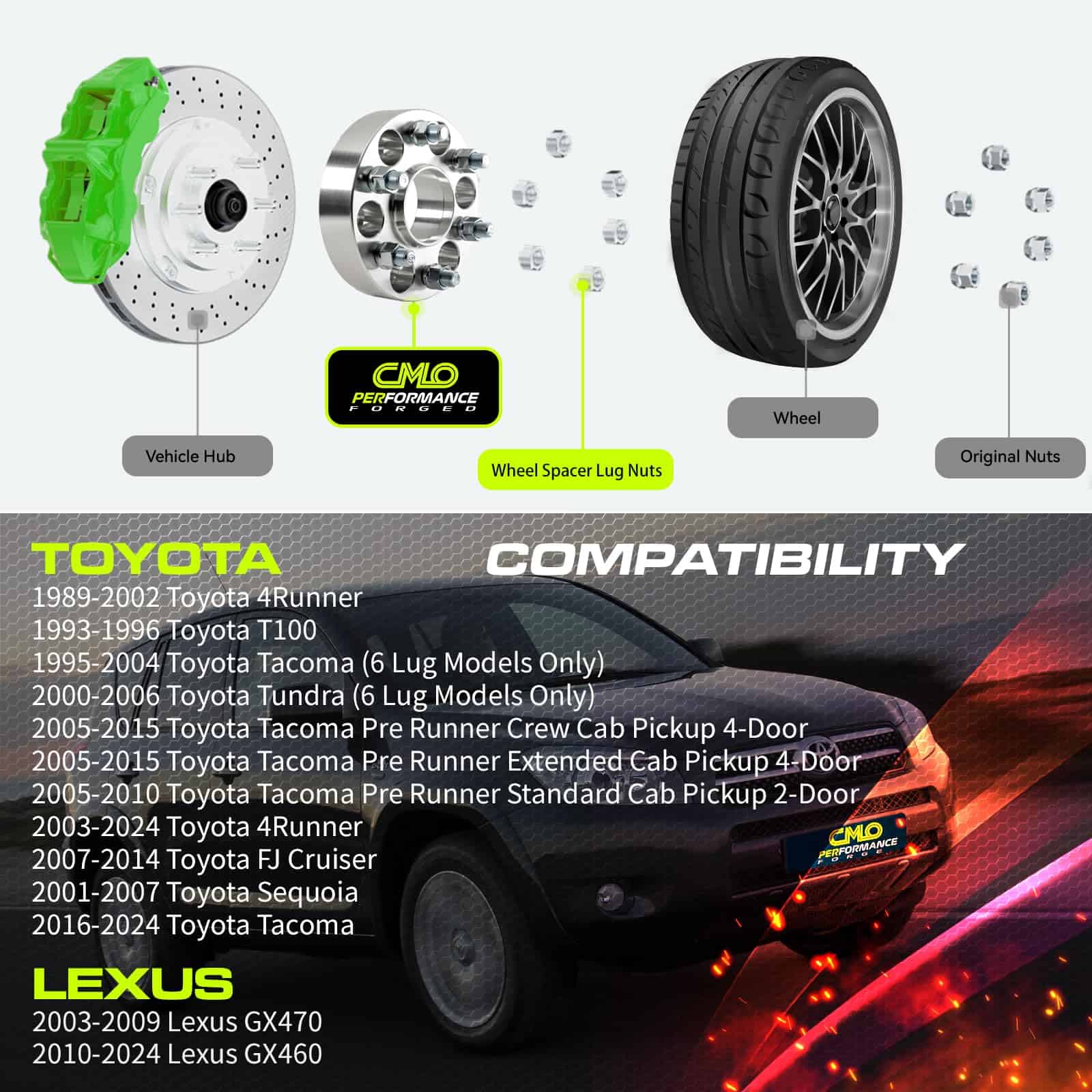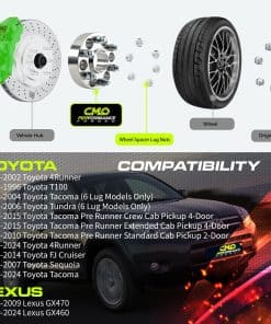 Los espaciadores de rueda Customadeonly están fabricados con aluminio de alta calidad 6061 T-6, conocido por su resistencia y durabilidad. Los separadores se ensamblan con pernos de acero de grado 10.9 (grado 8 SAE) tratados térmicamente. Los espaciadores cuentan con una garantía de producto de 2 AÑOS contra cualquier defecto funcional. Compatibles con Land Cruiser 1969-1997, Pick Up 1980-1995, 4Runner 1984-2008 (sólo modelos de 6 pernos), T100 1993-1996, Tacoma 1995-2008 (sólo modelos de 6 pernos), Tundra 2000-2006 (sólo modelos de 6 pernos).