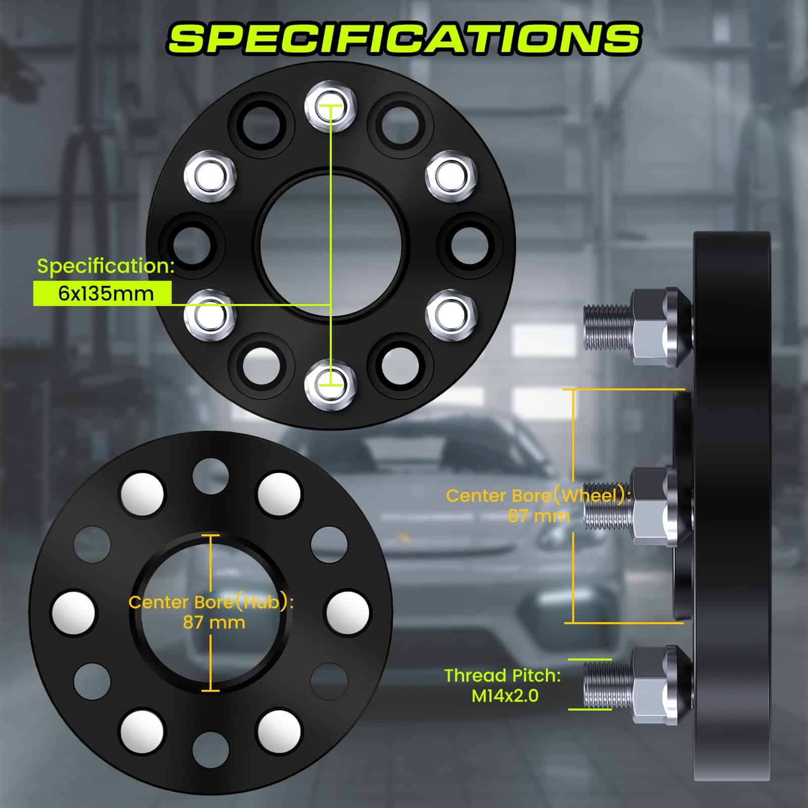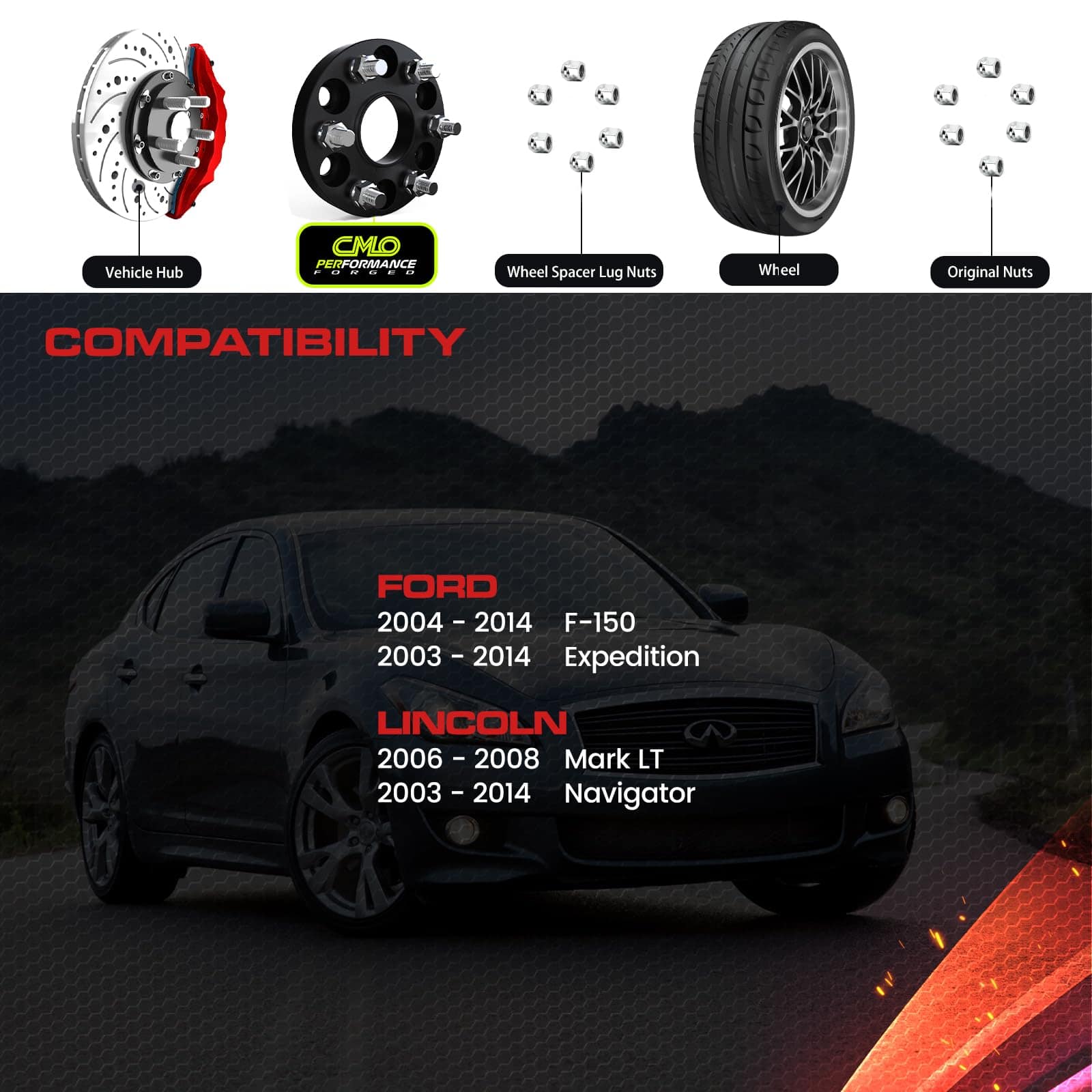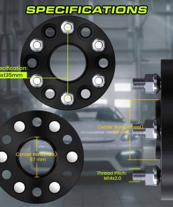1. Detalle del Producto Cantidad: 2 Piezas. Acabado: Anodizado negro. Diseño hubcentric (con borde centrado en la rueda) e instalación con pernos para aplicación 6×135, centro de 87.1 mm y paso de rosca 14×2 únicamente. Ancho: 75 mm (3 pulgadas) por lado. 2. Beneficios Nuestros espaciadores / adaptadores de rueda están hechos para corrección de compensación, mejorando el rendimiento en la manipulación y realzando la apariencia general. 3. Artesanía Los espaciadores de rueda Customadeonly son elaborados mediante el proceso CNC automatizado en nuestro centro de mecanizado de 4 ejes. Brindando calidad y precisión constantes a cada producto producido, lo que elimina el problema de desequilibrio que otras marcas pueden tener. 4. Calidad Hechos con aluminio de alta calidad 6061 T-6, el material es reconocido por su resistencia a la tracción y durabilidad. Los espaciadores están montados con pernos de acero al carbono clase 10.9 (grado 8 SAE) tratados térmicamente. Los espaciadores de rueda Customadeonly también cuentan con nuestra garantía de reemplazo de producto de 2 años contra cualquier defecto funcional. 5. Compatibilidad Compatible para Ford F-150 2004-2014 (solo 6 tornillos), Expedition 2003-2014 (solo 6 tornillos), Compatible para Lincoln Mark LT 2006-2008, Navigator 2003-2014 (solo 6 tornillos)