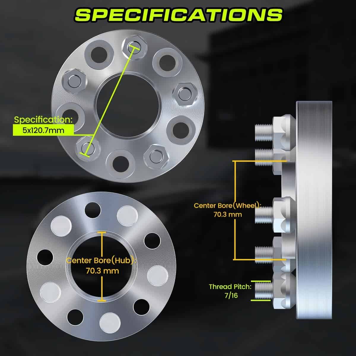 Espaciadores de Rueda Personalizados de 38mm (1.5 Pulgadas) de Centro de Cubo 70.3mm con Patrón de Pernos de 5×4.75 (5×120.7). Transforma y mejora el manejo y apariencia de tu vehículo con nuestros espaciadores de rueda precisión hechos. Diseñados para corregir offset, eleva el rendimiento y mejora el aspecto general. Descubre la mejor reactualización automotriz. Hechos con tecnología CNC automatizada, nuestro centro de mecanizado de 4 ejes garantiza calidad, precisión y elimina problemas de balance encontrados en otras marcas. Nuestros espaciadores de rueda están hechos de aluminio premium 6061 T-6, conocido por su excepcional resistencia a la tracción y durabilidad. Los espaciadores cuentan con pernos de acero al carbono de clase 10.9, tratados térmicamente para un rendimiento y confiabilidad mejorados. Los espaciadores de rueda de Customadeonly también cuentan con nuestra garantía de reemplazo de producto de 2 años contra cualquier defecto funcional. Si tienes alguna pregunta sobre nuestro producto, no dudes en contactarnos, estamos aquí para ayudarte.