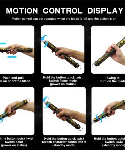 Característica Tiempo de carga Carga cíclica. Batería recargable y puerto de carga USB-C rápida, utiliza un cargador de 5V 1A para cargar y tardará 2 horas en cargarse completamente y jugar 4 horas. Versión RGB Baselit Premium, equipado con hoja de PC de 32 pulgadas, 16 efectos de sonido, 12 colores de hoja preestablecidos, 3 efectos de hoja, batería de iones de litio de 2000mAh. Método de operación Modo General 1. Presiona brevemente 1 vez —— Abrir espada 2. Toca el botón —— Blaster 3. Mantén pulsado el botón hasta que la luz del botón parpadee una vez —— Bloquear (estado de encendido)/Ajustar volumen (modo en espera) 4. Mantén pulsado el botón hasta que la luz del botón parpadee dos veces —— Cambiar colores (estado de encendido)/Cambiar efectos de sonido de personaje (modo en espera) 5. Mantén pulsado el botón hasta que la luz del botón parpadee tres veces —— Cambiar Modo (estado de encendido)/Cambiar BGM (modo en espera) 6. Mantén pulsado el botón hasta que la luz del botón parpadee cuatro veces —— Estado en espera 7. Mantén pulsado el botón hasta que la luz del botón parpadee cinco veces —— Control de movimiento activado 8. Mantén pulsado el botón hasta que la luz del botón parpadee seis veces —— Apagar Modo de control de movimiento 1. Gira el sable —— encender o apagar la hoja 2. Levanta la hoja y mantén pulsado el botón luego gira el sable —— Cambiar Modo (estado de encendido)/Cambiar efectos de sonido de personaje (modo en espera) 3. Baja la hoja y mantén pulsado el botón luego gira el sable —– Cambiar BGM (modo en espera)/Cambiar Color (estado de encendido)