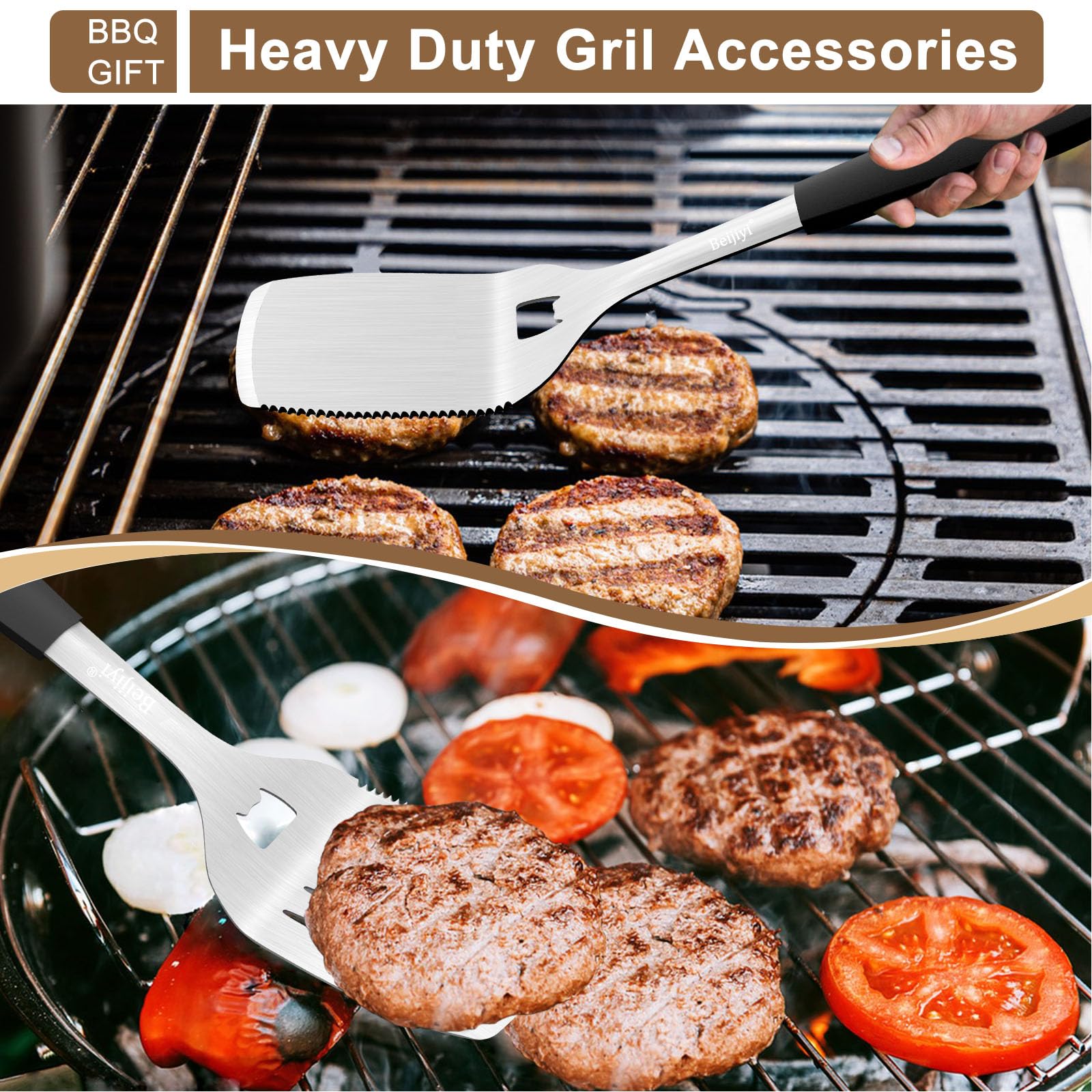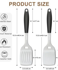Incluye dos prácticos utensilios de parrilla – espátula sólida y ranurada. Satisface tus diversas necesidades de parrilla, esta espátula de barbacoa de metal es perfecta para voltear hamburguesas y filetes en la parrilla, y el diseño ranurado puede drenar el exceso de grasa y líquido. Nuestras espátulas de parrilla están hechas de acero inoxidable premium espesado de 2 mm, el tratamiento de refuerzo las hace más fuertes y no se deformarán ni doblarán, y pueden soportar la alta temperatura y el ambiente severo de la parrilla al aire libre. El diseño del mango de silicona de espátula de metal de espiga completa es resistente y resistente al calor, proporciona un agarre seguro y antideslizante mientras que la longitud total de 15.9 pulgadas protege tus manos de las altas temperaturas. La espátula para parrilla tiene un abridor de botellas incorporado con bordes serrados y biselados afilados para una versatilidad óptima en la parrilla, permitiendo que los alimentos se vuelvan y se corten de manera suave y fácil, facilitando el corte de carne o verduras. Nuestros utensilios de parrilla de espátula BBQ son aptos para lavavajillas, el acero inoxidable pulido evita la acumulación de residuos de comida y es fácil de limpiar, y el diseño de una sola pieza sin costuras garantiza que no haya acumulación de agua en el mango.