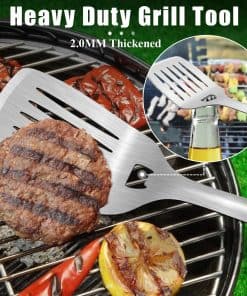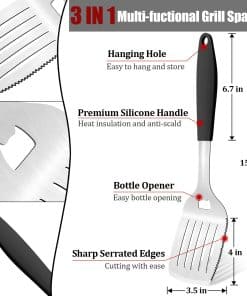 Multiusos, esta espátula de parrilla 3-en-1 también puede usarse para abrir botellas, lo que la convierte en una herramienta versátil para todas tus necesidades de parrilla. Su diseño integrado con una superficie lisa y sin costuras permite una limpieza fácil y evita la acumulación de residuos de alimentos. Se puede lavar a mano o en lavavajillas para un mantenimiento sencillo. Además, el mango incluye un gancho para secado y almacenamiento conveniente.