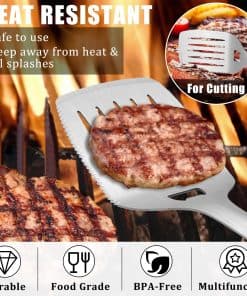 El mango de acero inoxidable de cuerpo completo de 11.8 pulgadas es resistente y altamente resistente al calor, evitando que se agriete. Su longitud evita quemaduras al alcanzar una parrilla grande. La hoja afilada está expertamente diseñada con bordes afilados para voltear y bordes dentados para cortar, lo que te permite voltear y cortar alimentos sin esfuerzo y verificar su cocción.