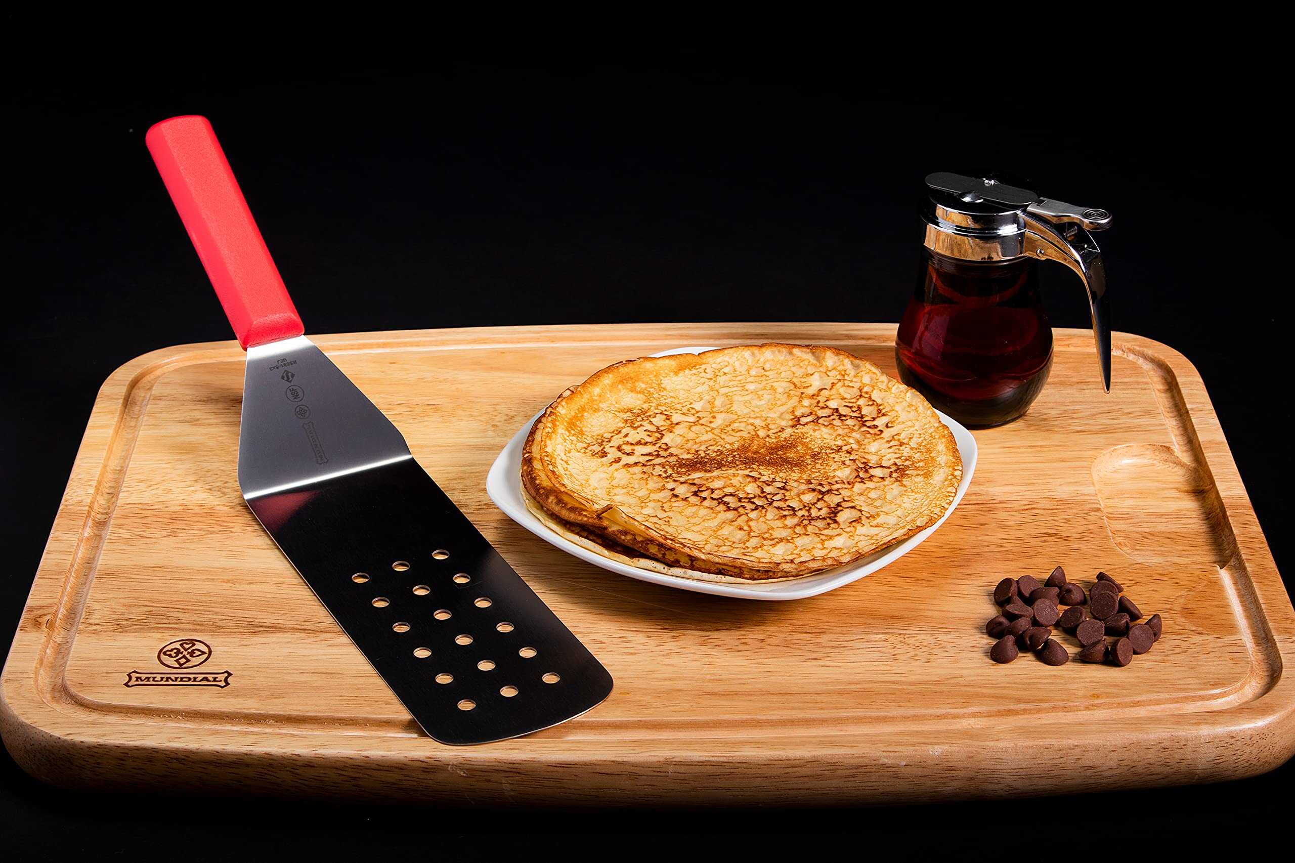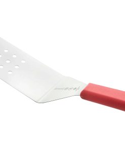 Espátula perforada de la serie Mundial 5600 de 8 pulgadas x 3 pulgadas con hoja de acero inoxidable de grado alimenticio y mango rojo. Herramienta para dar vuelta, voltear, servir o remover alimentos, como carne y verduras. El mango de polipropileno está diseñado ergonómicamente para proporcionar un agarre seguro y antideslizante. Garantía limitada de por vida.