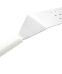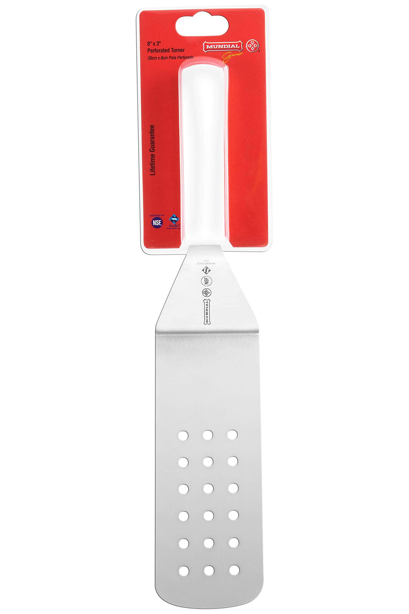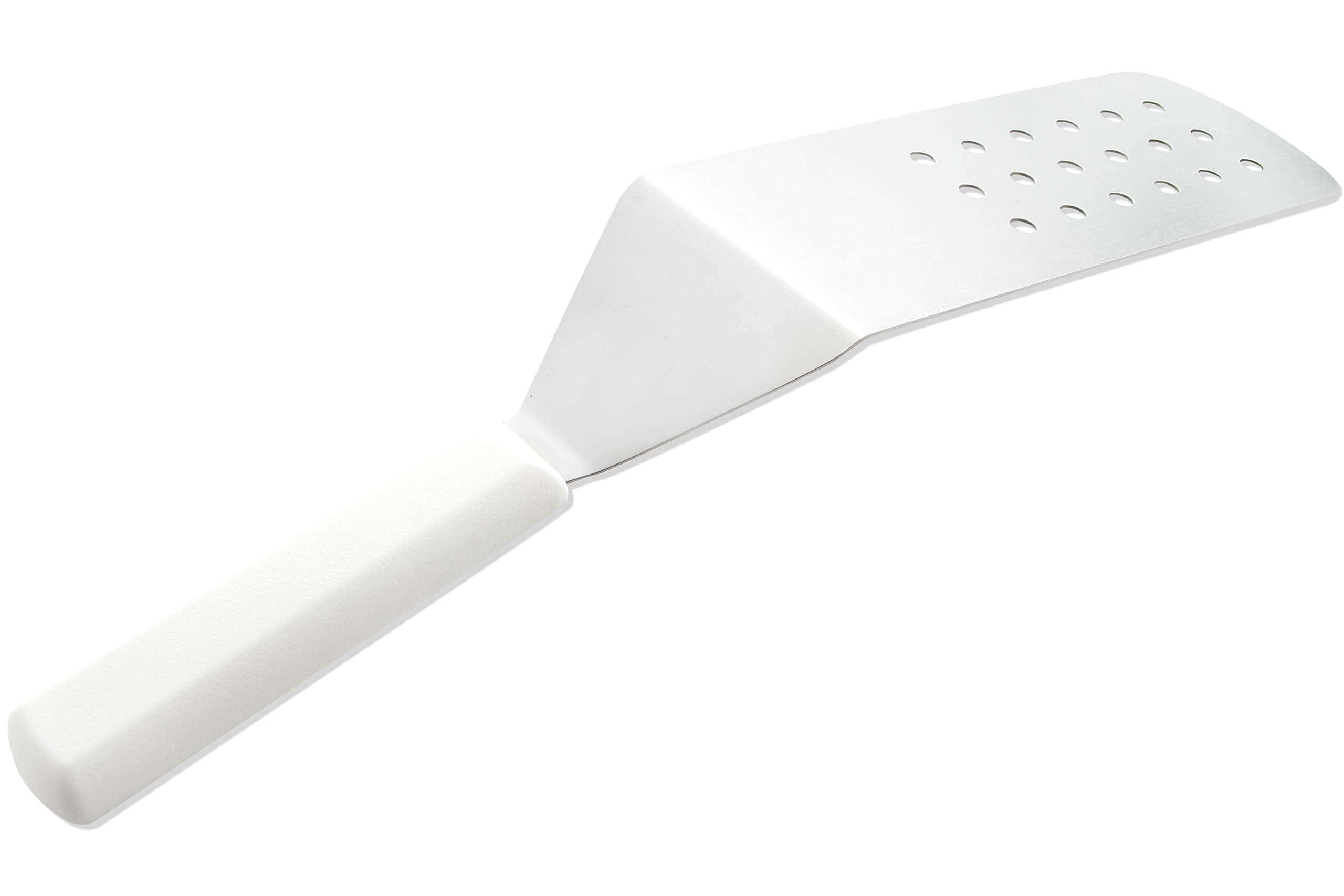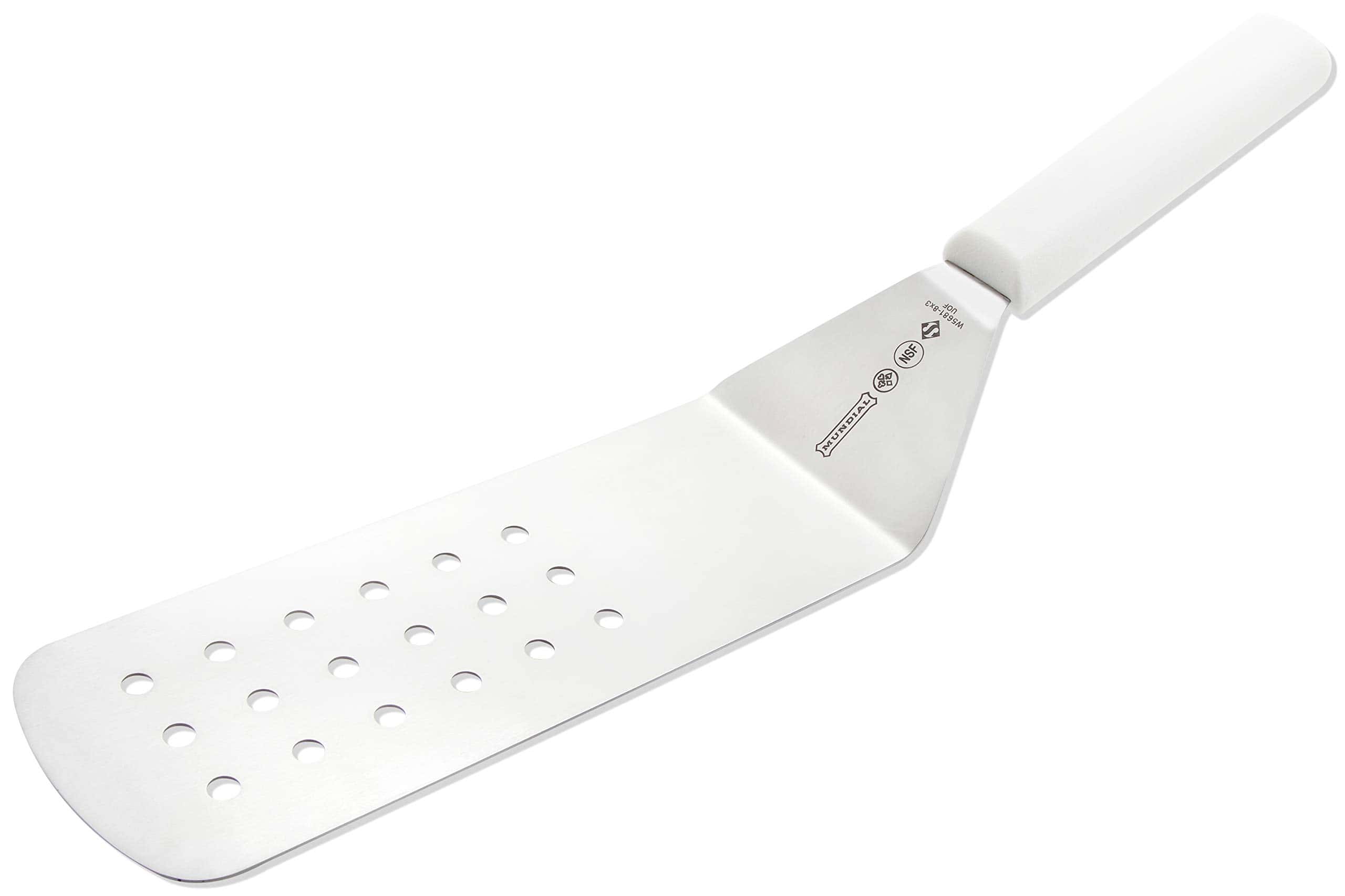 Espátula perforada de la serie Mundial 5600 de 8 pulgadas por 3 pulgadas con hoja de acero inoxidable de grado de servicio de alimentos. Herramienta para dar vuelta, voltear, servir o revolver alimentos, como carne y verduras. El mango de polipropileno está diseñado ergonómicamente para proporcionar un agarre seguro y antideslizante. El mango también está disponible en color negro. Garantía limitada de por vida.