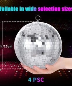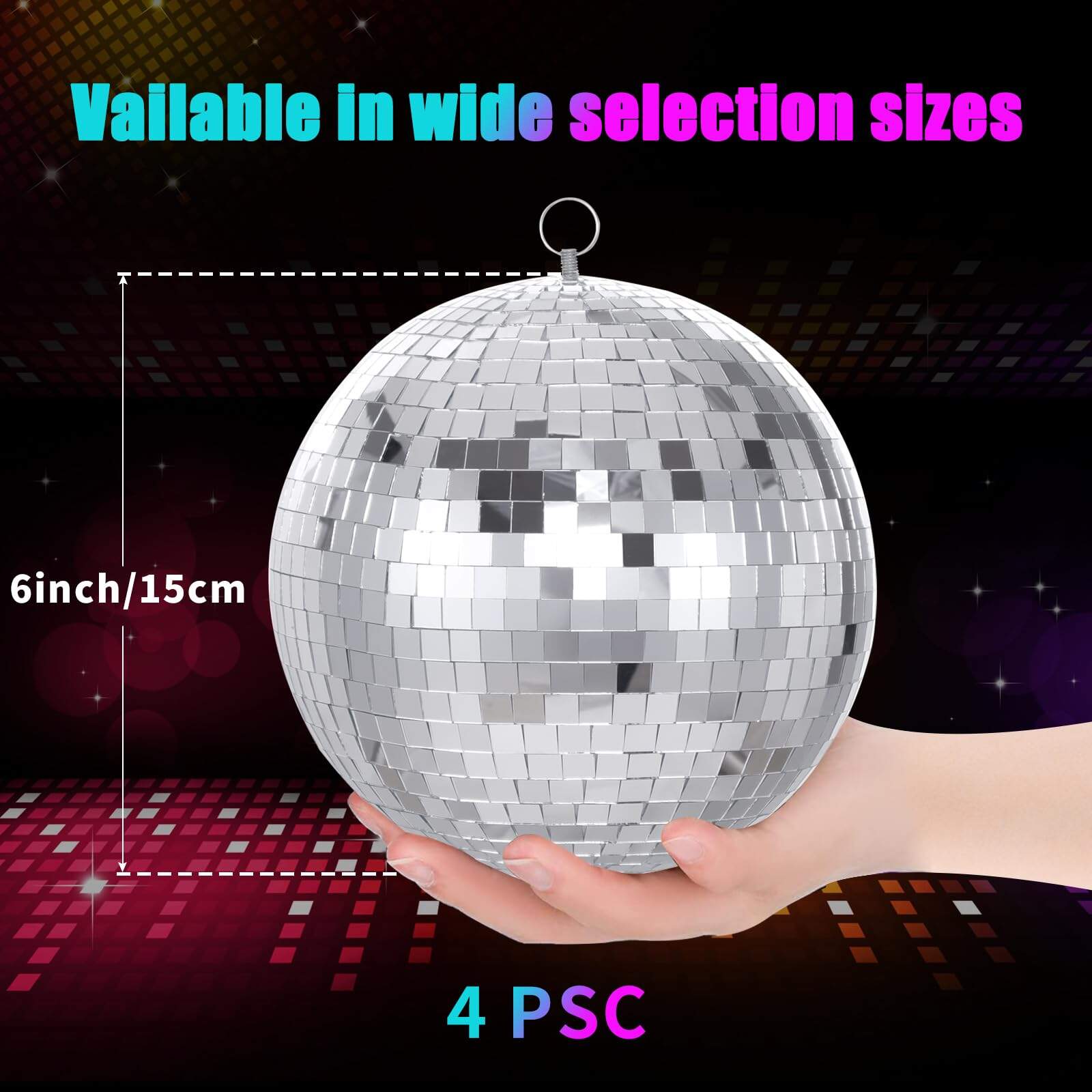 1. Set de Bola de Espejo de Discoteca: Hay 4 piezas de bolas de vidrio de espejo de 6 pulgadas en el paquete, puedes compartir estas bolas de discoteca con tu familia y amigos en la reunión de la fiesta y compartir la diversión juntos. Mejora el sentido de la atmósfera de la fiesta de bolas de festival de música.
