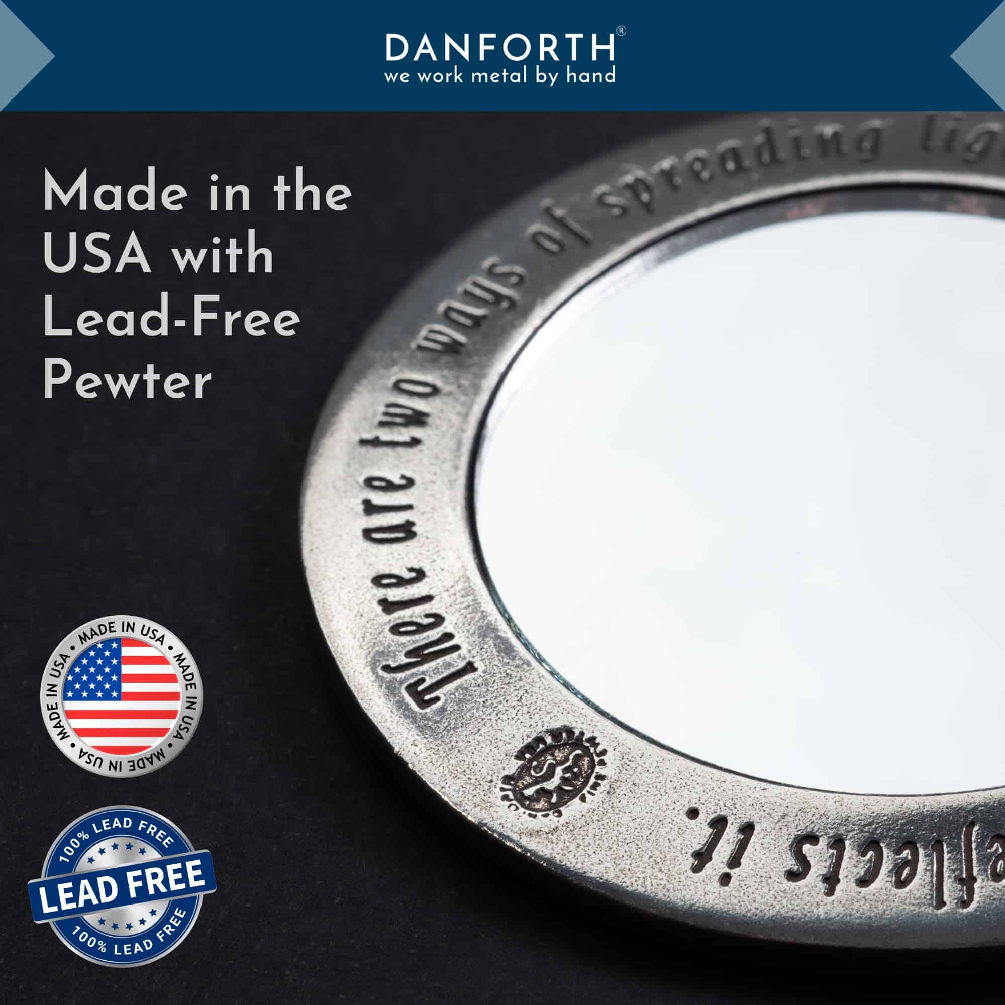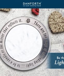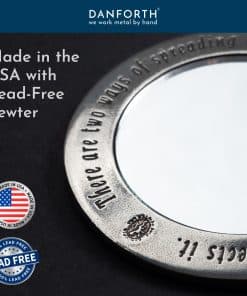 1. Tamaño perfecto para llevar en el bolso; Inscripción en la parte trasera que dice «Hay dos formas de difundir la luz; ser la vela o el espejo que la refleja». 2. Viene en una bolsa de franela y caja de regalo; Mide 3 1/2 pulgadas de diámetro. 3. Hecho solo con el mejor peltre, 100% libre de plomo. 4. Hecho a mano en Vermont. 5. Exquisita artesanía: Estos productos se elaboran con cuidado, presentando piezas bellamente diseñadas hechas de peltre crudo; Perfectos como coleccionables o regalos pensados.