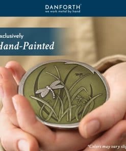 ¡Nunca puede tener demasiadas joyas bonitas y accesorios elegantes! Este espejo de mano de pewter verde y pewter de Danforth es un regalo sentimental para cualquier ocasión: cumpleaños de la hermana, regalo de recuerdo o duelo, Día de los Abuelos, regalo de Navidad para la esposa, regalo de cumpleaños para la adolescente o la sobrina, regalo de dama de honor, regalo de madre de la novia, recuerdo de boda o un encanto de la naturaleza para tu mejor amiga. Este espejo de bolsillo de metal de pewter hecho a mano 100% no tóxico y libre de plomo está intrincadamente detallado en ambos lados. El frente presenta una escena basada en la naturaleza con un fondo verde, hojas de pasto pintadas a mano y una prominente libélula de pewter. La parte trasera tiene un espejo discreto con baby libélulas revoloteando alrededor de su reflejo. Este mini espejo de 3 pulgadas encaja perfectamente en su mano, bolso, abrigo, bolsillo, maletín, estuche de maquillaje o neceser. Nuestro fino accesorio de regalo de pewter viene guardado dentro de un estuche de franela para mantenerlo libre de manchas hasta su próximo chequeo de estilo y sonrisa. En Danforth Pewter, la belleza está en los detalles. Nuestras colecciones de accesorios hechos a mano ofrecen algo para cada estilo y personalidad: bohemio, femenino, moderno, vintage, elegante, amante de la naturaleza, artesanía americana y funcionalidad diaria. Todas nuestras joyas de pewter, tiradores de cremallera, espejos de bolsillo y amuletos de bolsillo están hechos a mano en nuestro taller de Middlebury, Vermont, por lo que sabes que cada uno es tan único como tú. Encuentra ese regalo especial, regalo de stock o recuerdo de fiesta en Danforth Pewter. Siempre hecho en EE. UU.