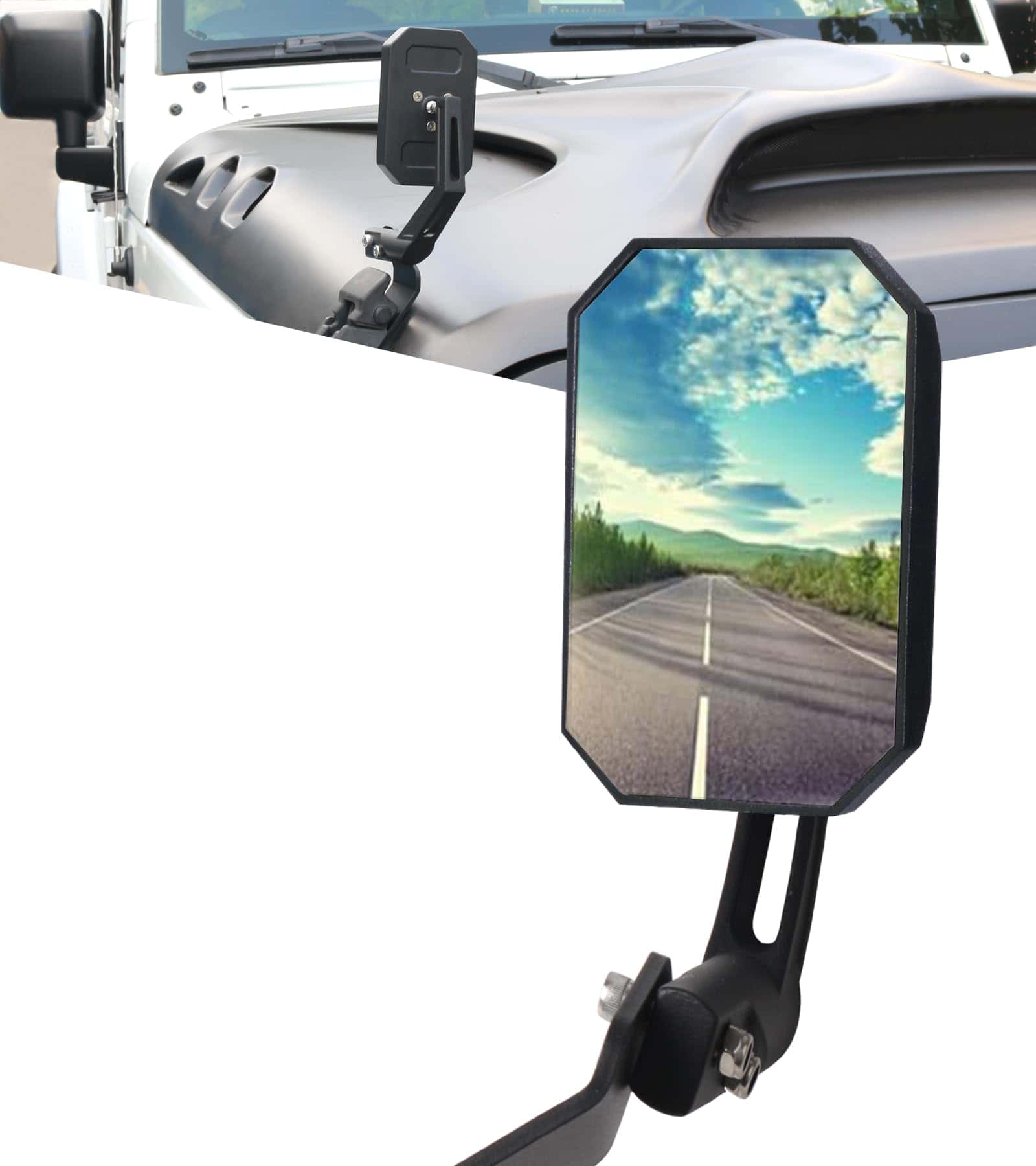 1. COMPATIBILIDAD Actualice el Espejo de Capó que gira 360 grados compatible con Wrangler JK 2-PUERTAS y Unlimited JK 4-PUERTAS / Wrangler JL 2-PUERTAS y Unlimited JL 4-PUERTAS / JT.