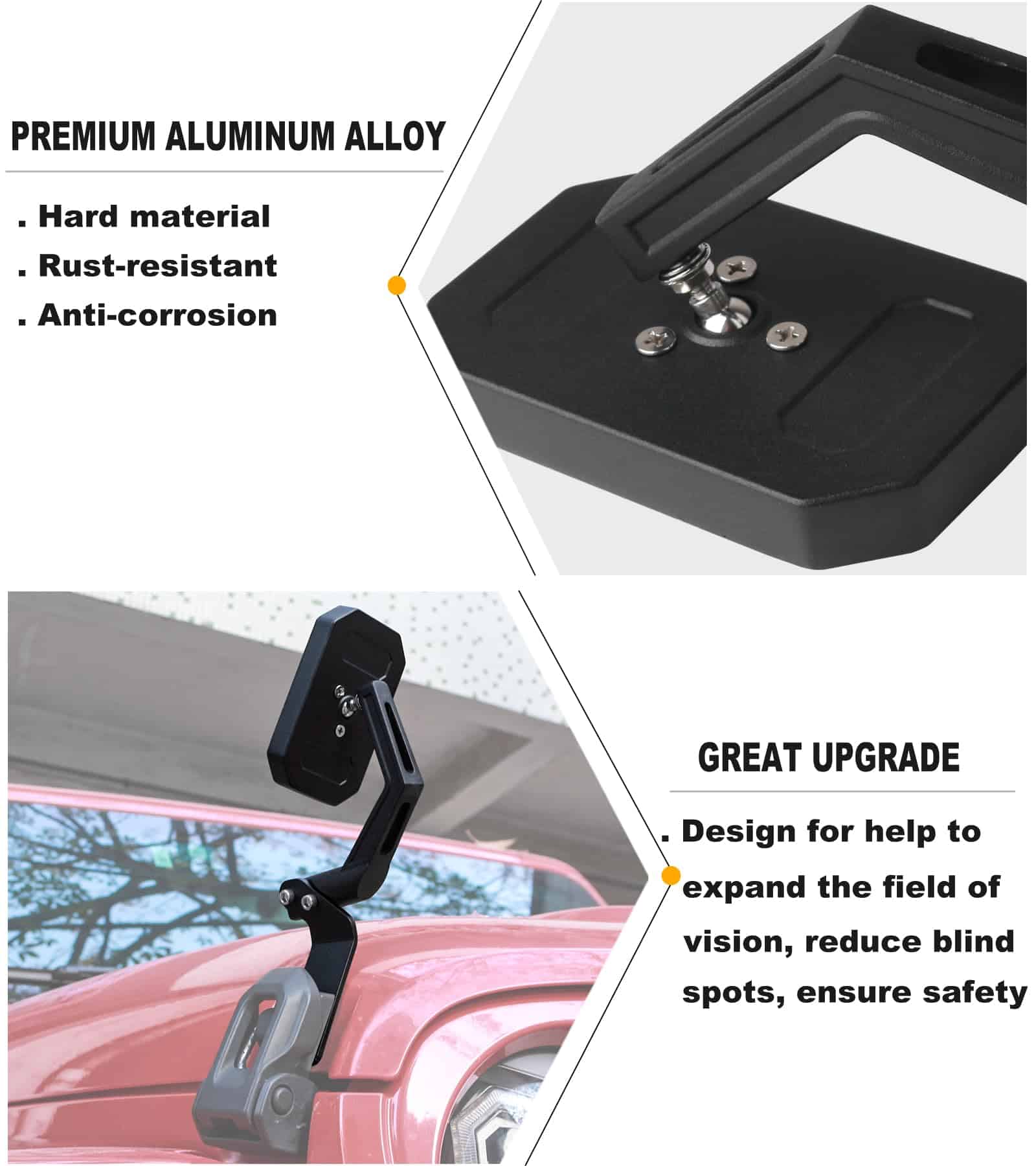4. MATERIAL DURADERO Espejo de Punto Ciego del Cierre del Capó hecho de carcasa de aleación de aluminio premium, alta resistencia, resistente al óxido y anticorrosión, duradero y duradero.
