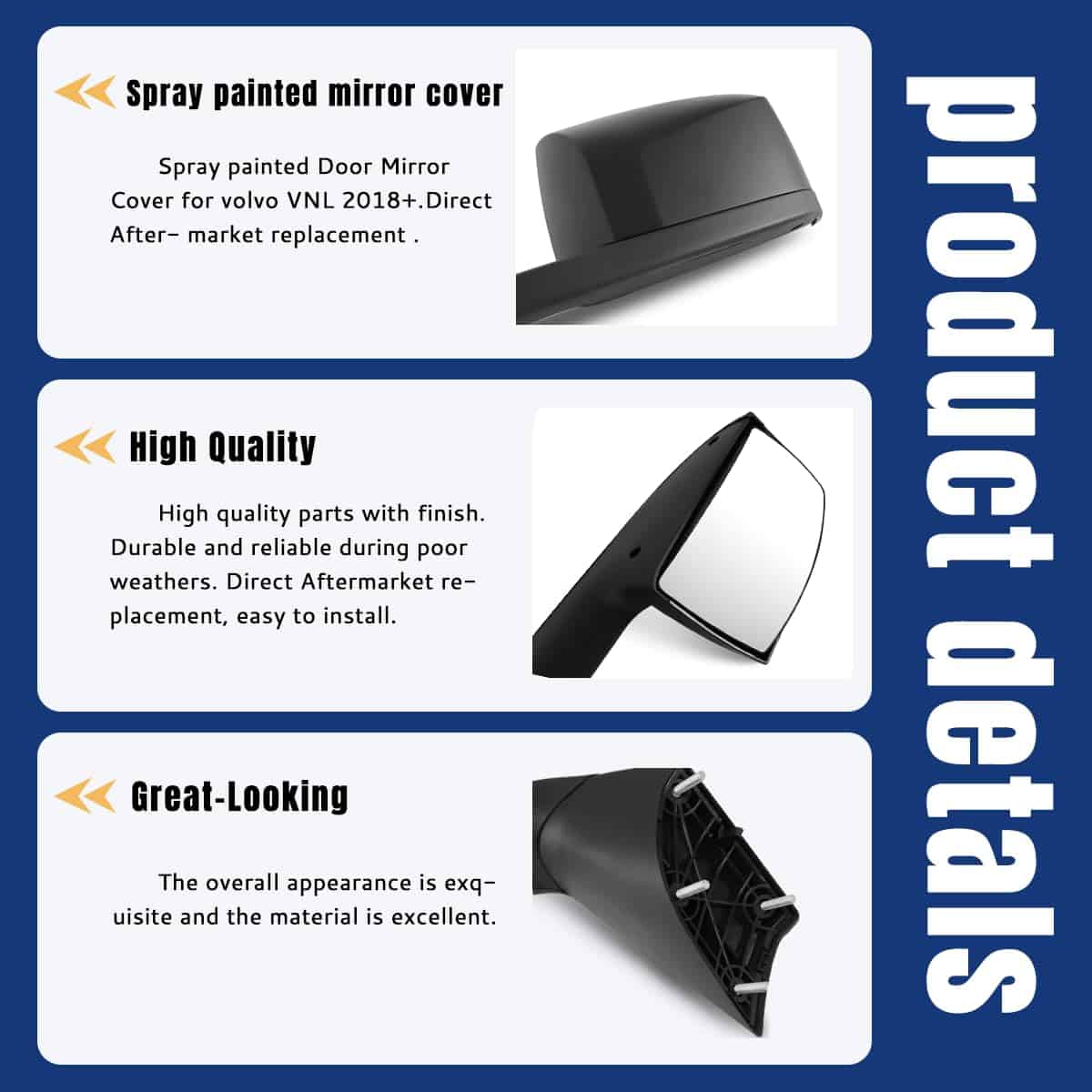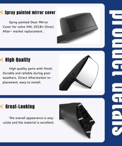 Espejo de capó derecho del pasajero de reemplazo para Volvo VNL 2018-2024 en negro. Este espejo está diseñado para reemplazar un espejo original, proporciona un mejor y más amplio ángulo de visión trasera, mejora la visibilidad y reduce los puntos ciegos, mejorando así la seguridad vial. Confeccionado con piezas de alta calidad con acabado cromado, este espejo es duradero y confiable incluso en condiciones climáticas adversas. Fácil de instalar, el espejo se puede atornillar directamente y de forma segura, proporcionando estabilidad incluso en caminos irregulares. Además, se incluye una garantía normal de 6 meses para cualquier daño que no sea causado por factores humanos.