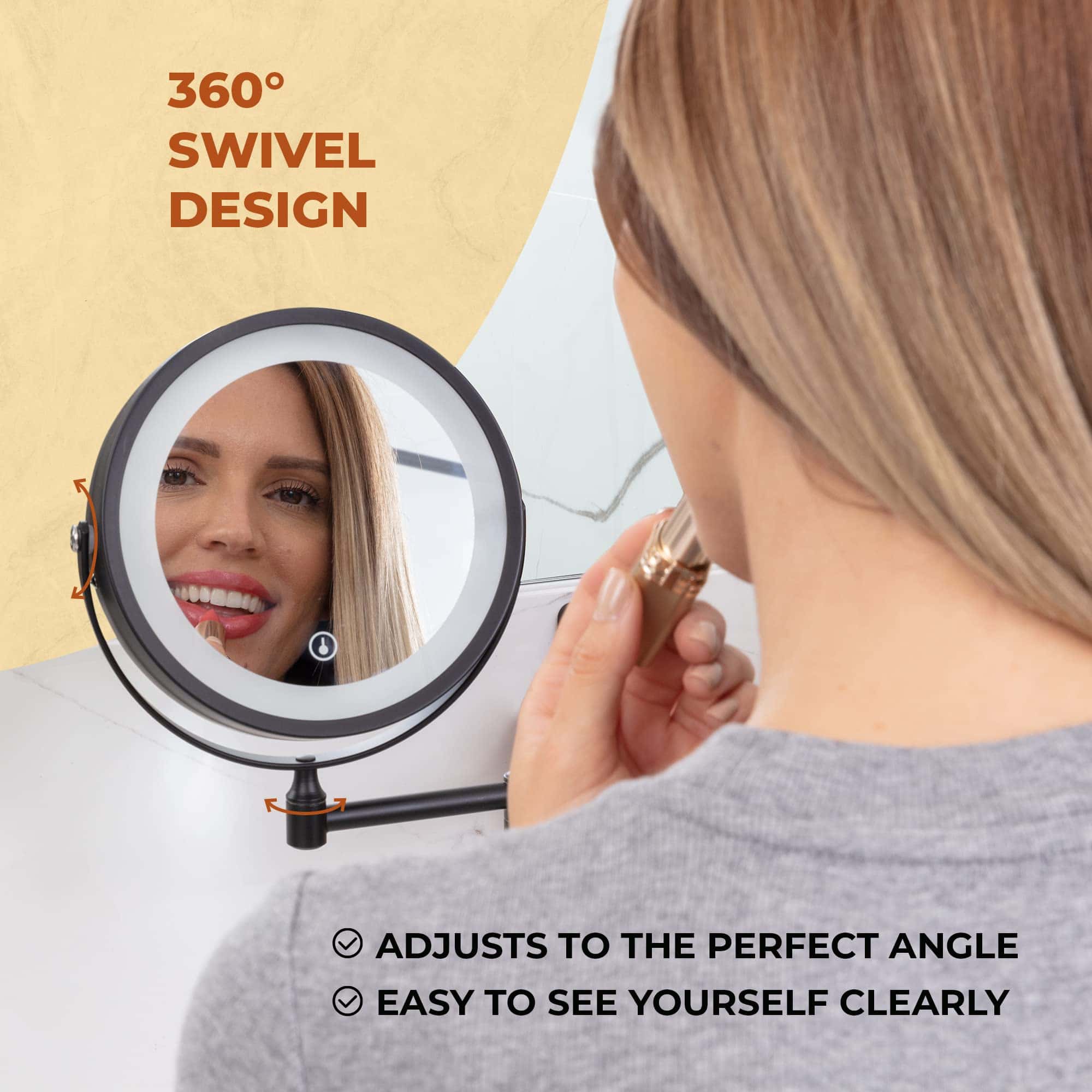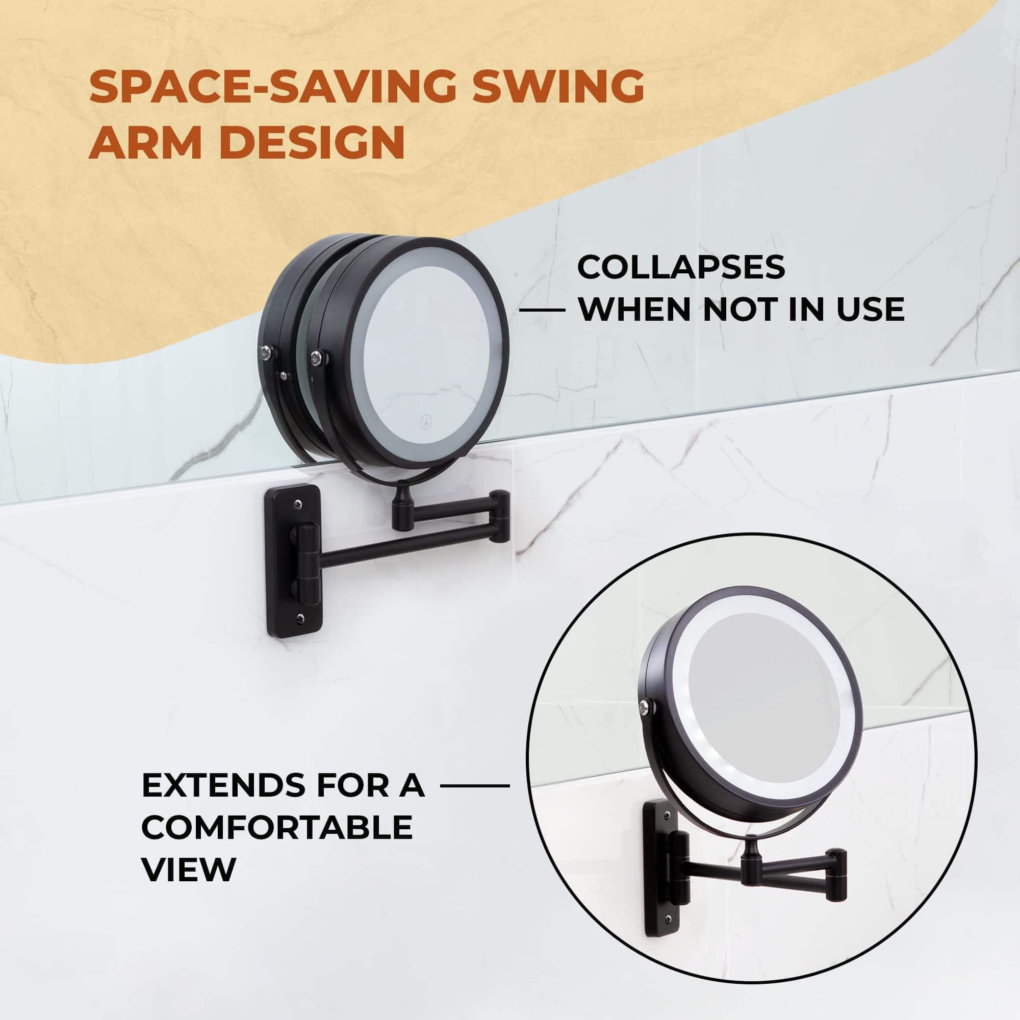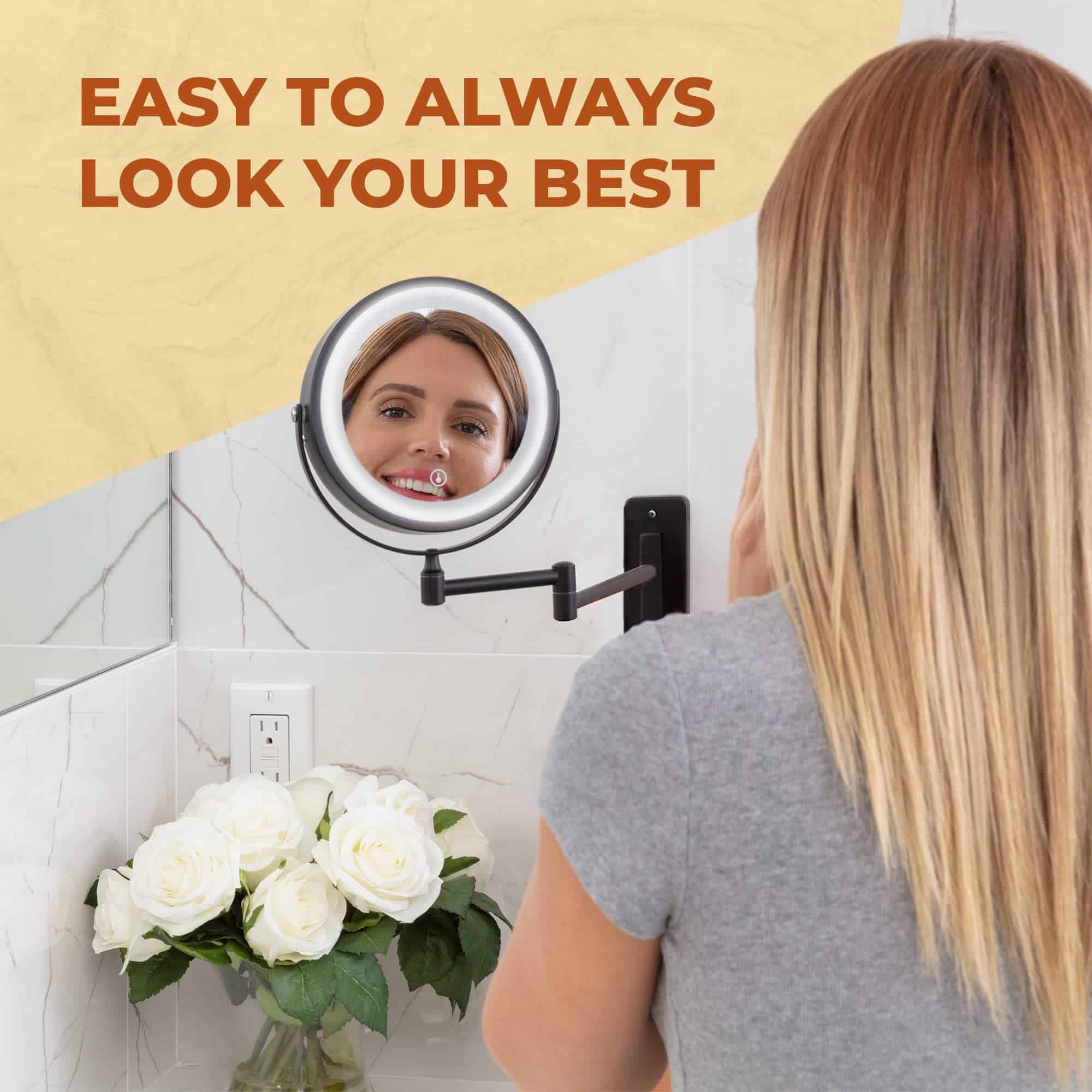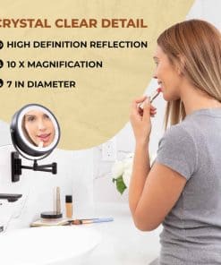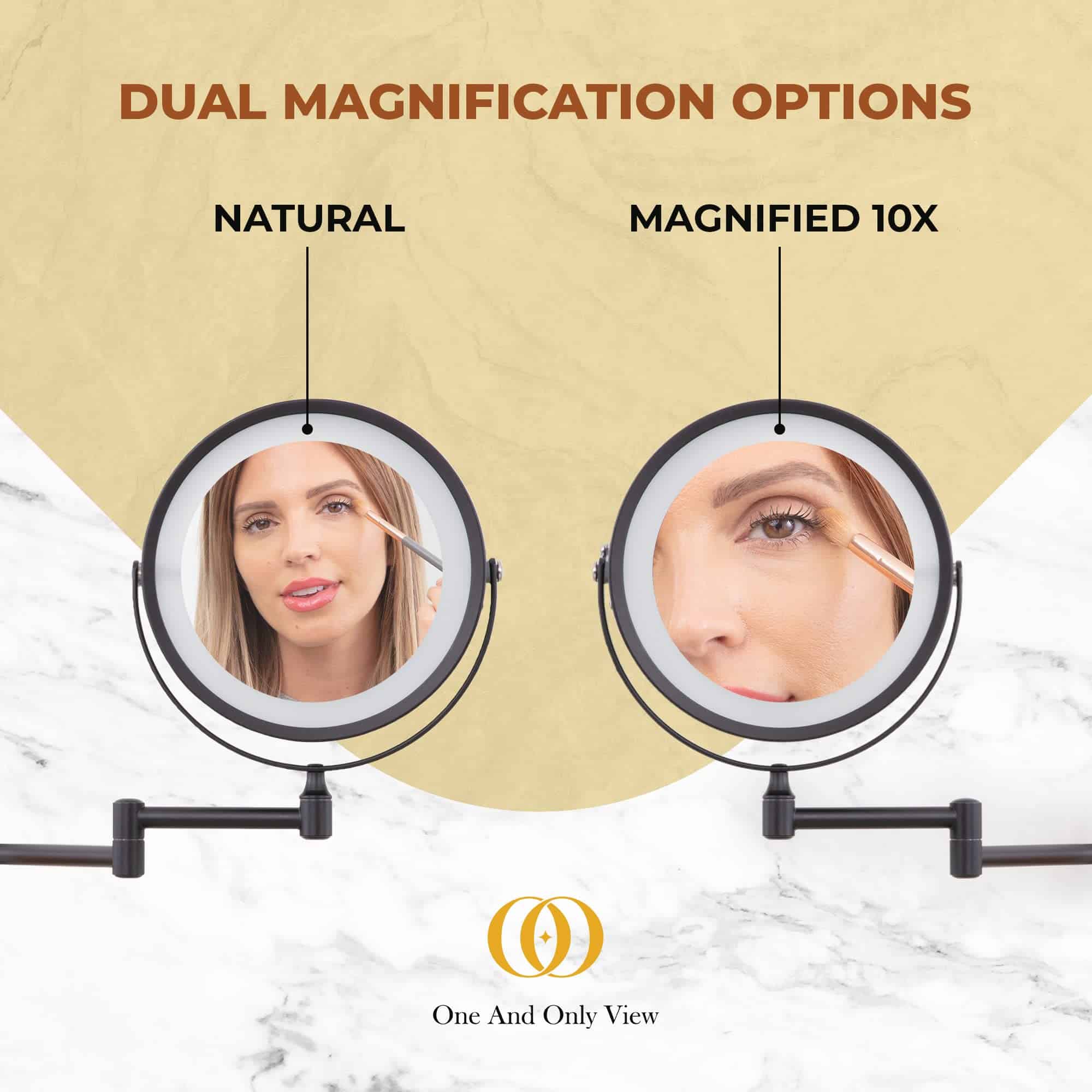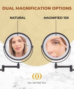 Nuestro espejo de tocador con aumento de 10X te permite enfocarte en detalles finos en alta definición, como delineadores más oscuros o depilación precisa de cejas. En contraste, los tres ajustes de luz brillante te permiten ver tu rostro con mayor claridad para que puedas aplicar tu maquillaje y productos para el cuidado de la piel con facilidad. Ve cómo se verá tu maquillaje durante el día, la noche o en cualquier momento. El espejo cosmético con botón táctil de aumento se extiende desde la pared y proporciona un aumento de 10x cuando lo necesitas, luego se pliega contra la pared cuando no lo necesitas. ¡Con Only One View, lucirás impecable cada vez!