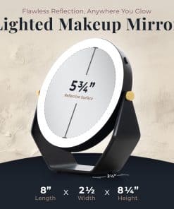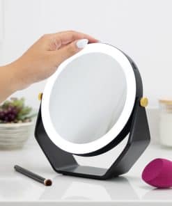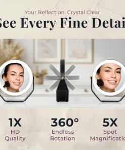 Si estás buscando a tu nuevo mejor amigo de belleza, ¡no busques más! Un espejo de tocador giratorio LED de 2 caras es el espejo de tocador y maquillaje portátil perfecto. Enciende la brillante iluminación LED para iluminar uniformemente toda tu cara. Prepara en cualquier habitación con un diseño completamente inalámbrico que utiliza 5 pilas AAA. Observa cada detalle fino con las potentes magnificaciones de 5 veces y 1 vez. Cambia rápidamente entre cada lado de magnificación gracias a la rotación infinita de 360 grados de la cabeza interna del espejo. Una gran reflexión te permite ver una vista completa de tu cara y cabello para crear fácilmente cualquier look de belleza en una sola mirada. Ajusta infinitamente el ángulo de la cabeza del espejo y cambia sin esfuerzo entre las magnificaciones para que puedas prepararte aún más rápido.