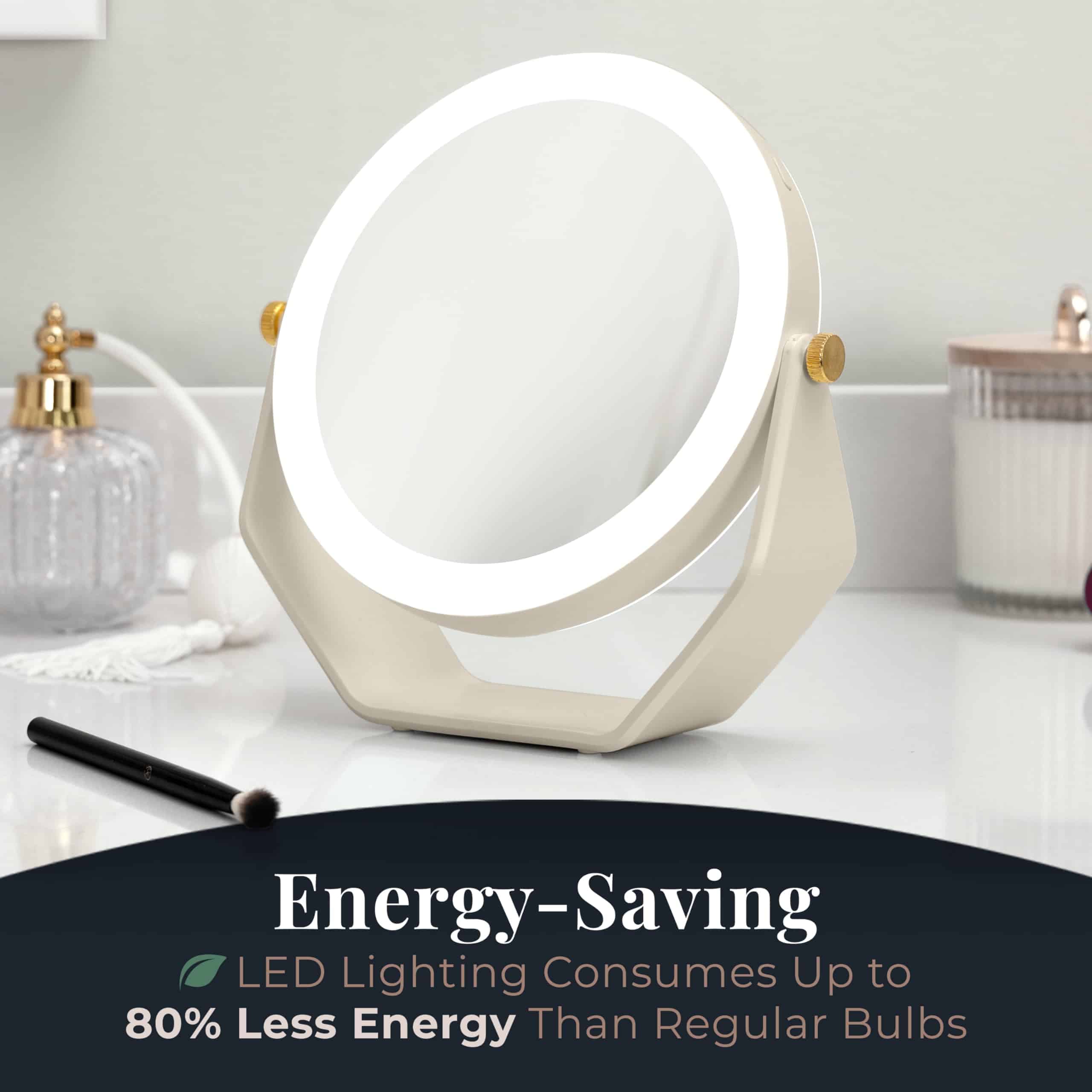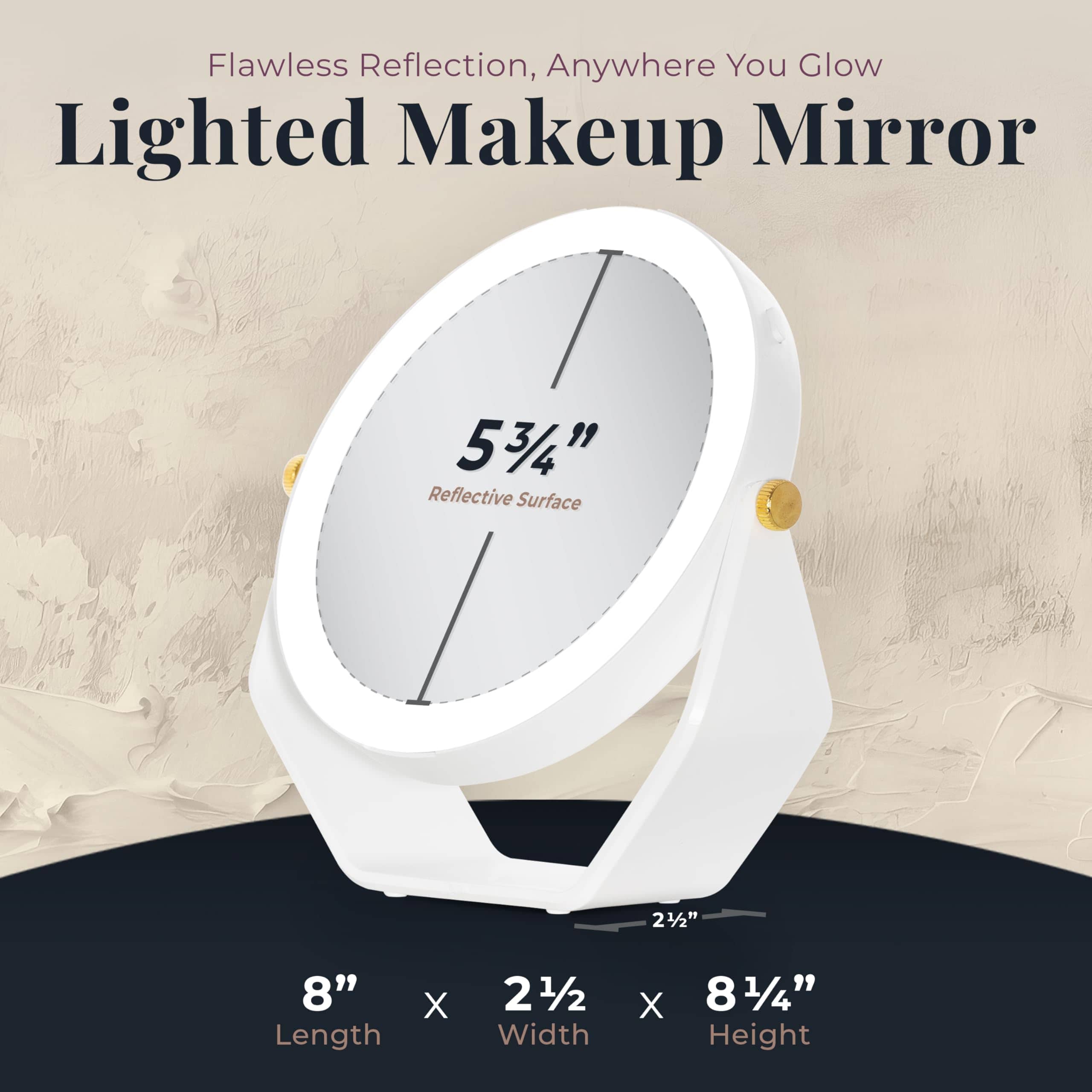 ¡Si estás buscando tu nuevo mejor amigo de belleza, no busques más! Un espejo giratorio LED iluminado de doble cara es perfecto para el tocador y como espejo de maquillaje portátil. Enciende la brillante iluminación LED para iluminar uniformemente toda tu cara. Prepárate en cualquier habitación con un diseño completamente inalámbrico que utiliza 5 pilas AAA. Observa cada detalle con las potentes magnificaciones de 5 veces y 1 vez. Cambia rápidamente entre cada lado de aumento gracias a la rotación infinita de la cabeza interna del espejo de 360 grados. Una gran reflexión te permite ver una vista completa de tu cara y cabello para crear fácilmente cualquier look de belleza con un solo vistazo. Ajusta infinitamente el ángulo de la cabeza del espejo y cambia sin esfuerzo entre las magnificaciones para que puedas prepararte aún más rápido.