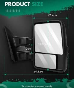 Este Espejo de Remolque SCITOO es compatible con los modelos 2003-2007 de Ford F250/F350/F450/F550 Super Duty y el modelo 2003-2005 de Ford Excursion. Cuenta con funciones de plegado manual, telescópico manual, cubierta negra, vidrio ajustado manual y luz de señal de giro. El paquete incluye un espejo de remolque para el lado derecho (lado del pasajero). La instalación es sencilla, simplemente desmonte los tornillos fijos de la placa de plástico del automóvil con un destornillador, desmonte la placa de plástico para ver el espejo retrovisor y los tornillos de la puerta, instale el nuevo espejo retrovisor a través de la ventana y bloquee el tornillo de la puerta, luego mueva la placa de plástico al original. ¡No olvide ajustar el ángulo del espejo después de la instalación! Verifique si su vehículo tiene las mismas funciones que los espejos de remolque de SCITOO, como la luz de señal de giro, de lo contrario, algunas funciones podrían deshabilitarse.