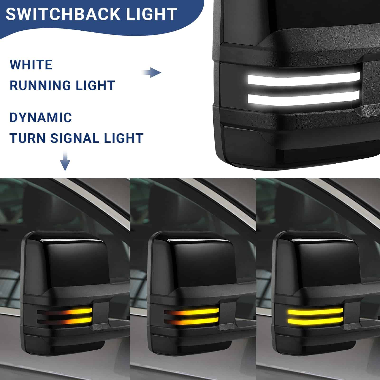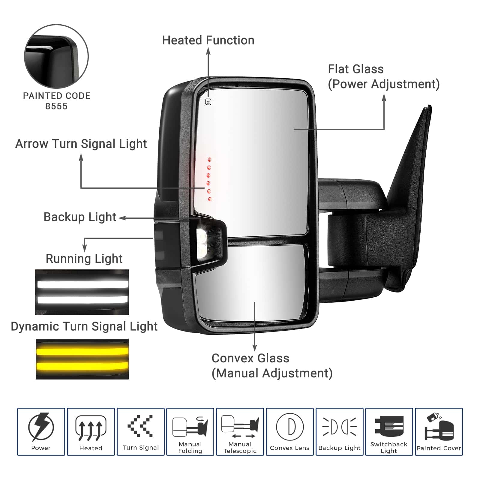 1. Compatible con: Sierra 1500 2003-2006; Escalade ESV EXT; Avalanche 1500, 2500; Suburban 1500, 2500; Tahoe; Yukon XL 1500; Yukon XL 2500; Silverado 2500 2003-2004; Sierra 2500; Sierra 1500 HD. 2. Compatible con: Silverado 1500 HD 2003; classic Silverado 1500 HD, GMC Sierra 1500 HD 2005-2007; classic Silverado 1500, 2500HD, 3500 2003-2007; Sierra 2500 HD, Sierra 3500 2003-2007. 3. Funciones: Luz LED de giro intermitente y luz de giro en la parte trasera + Luces de señal de giro en el espejo + Vidrio eléctrico ajustable + Descongelamiento térmico + Lámpara de marcha atrás + Vidrio doble (Vidrio plano + Vidrio convexo) + Telescópico y plegable manualmente. 4. Excelente calidad: Nuestros espejos de remolque están fabricados con estándares de control de calidad estrictos, no se sacudirán ni vibrarán al conducir. Fabricados con base de aluminio ultra resistente y carcasa pintada a medida en negro. 5. Lo que obtienes: Un par de espejos de remolque, incluyendo lado izquierdo y lado derecho.
