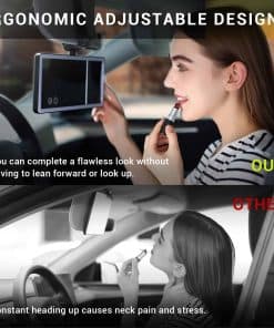 1. Diseño patentado de protección para el cuello. Espejo de coche que se puede bajar para su uso, ajustado al ángulo cómodo que desees y que puede girar 360 grados. Puedes maquillarte en el coche cómodamente, sin necesidad de estirar el cuello ni sentir cansancio.