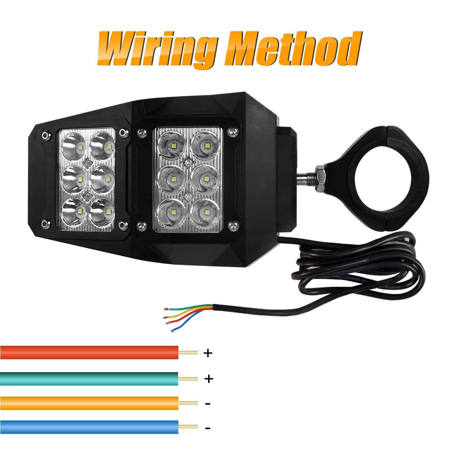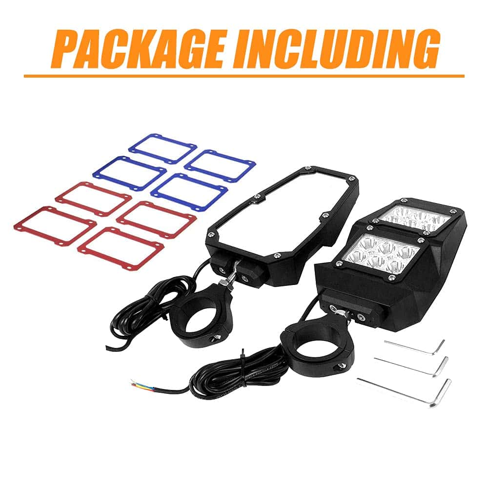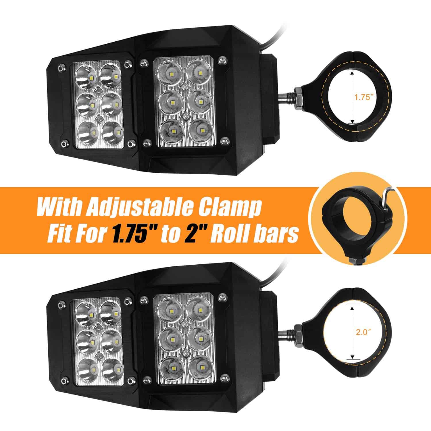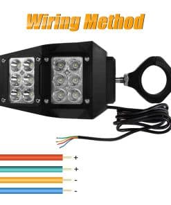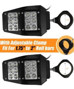 Compatible con barras de 1.75″ a 2″. Especificaciones: Voltaje: DC 9-12V, Potencia: 18W, Lúmenes: 5400 LM, Corriente: 2.4A, Vida útil: Más de 25,000 horas, Tasa de impermeabilidad: IP68.