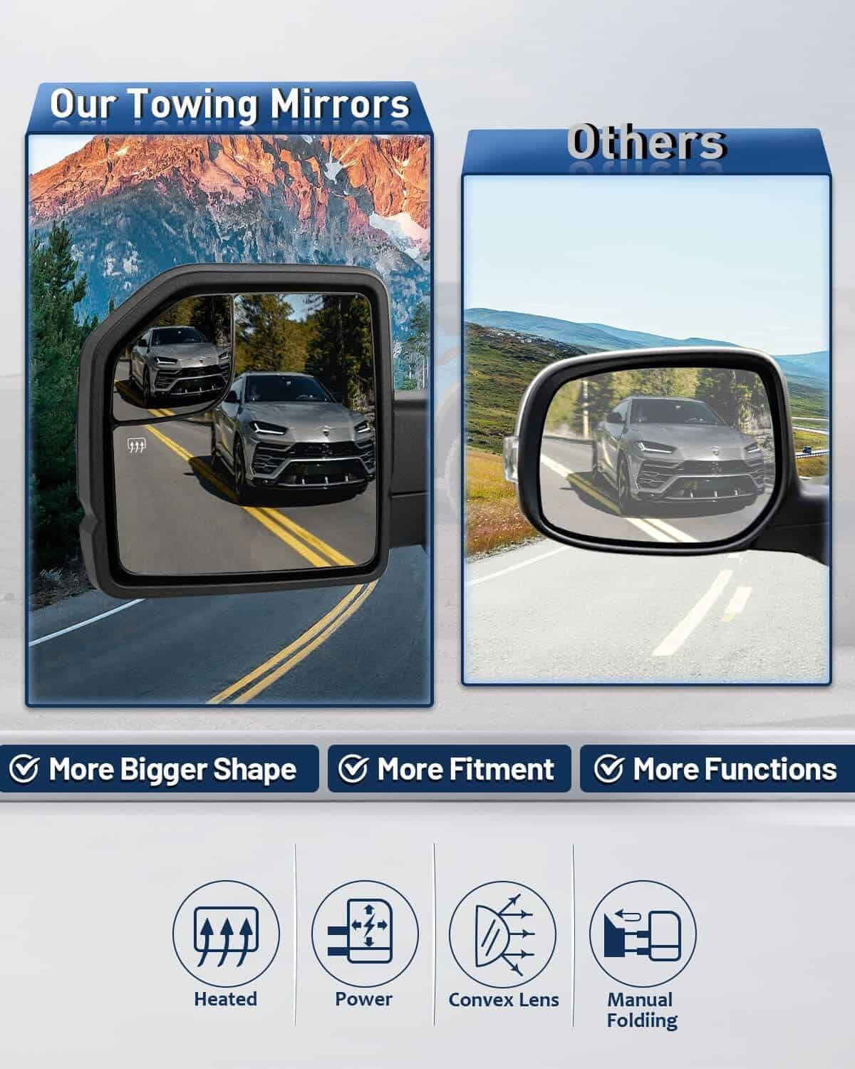 2. Multifunción de espejos de remolque – Elija entre espejos de remolque equipados con varias funciones: Ajuste de potencia, calefacción, sin luz de señal de giro, sensor de temperatura, con carcasa negra, plegado manual y telescópico.