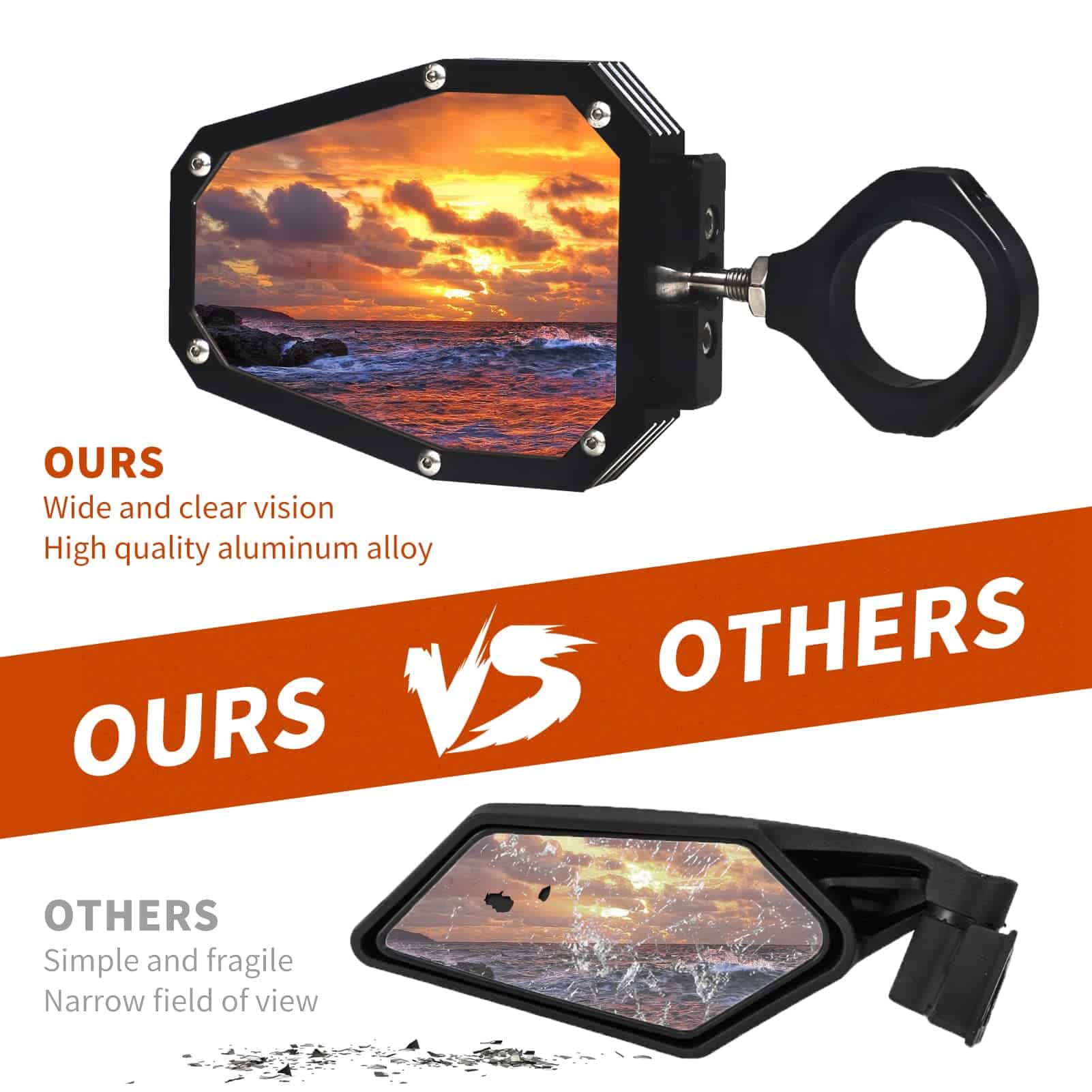 Fabricados con materials de alta calidad como carcasa de ABS, lente de vidrio irrompible y tornillos de acero inoxidable, estos espejos son resistentes y duraderos, adaptándose a diversas condiciones climáticas adversas sin sufrir daños. Con estos espejos, puedes conducir con confianza y seguridad durante muchos años.