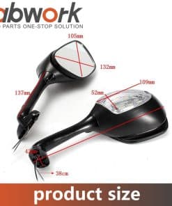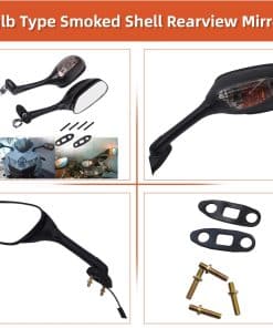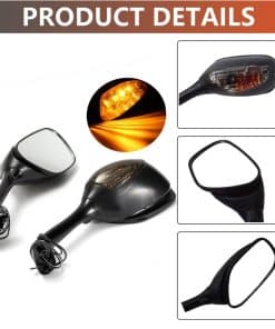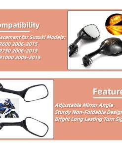 Espejos Negros con Indicadores de Dirección Ahumados Reemplazo para Suzuki GSXR600 GSXR750 2006-2015, GSXR1000 2005-2015. Este par de espejos negros con indicadores de dirección ahumados es el accesorio perfecto para tu motocicleta Suzuki. Construidos con un diseño resistente y no plegable, estos espejos ofrecen un ángulo ajustable para una visión óptima. Los indicadores de dirección integrados son extremadamente brillantes y duraderos, proporcionando una mayor seguridad durante tus desplazamientos. Por favor, asegúrate de verificar cuidadosamente la compatibilidad del producto antes de realizar la compra.