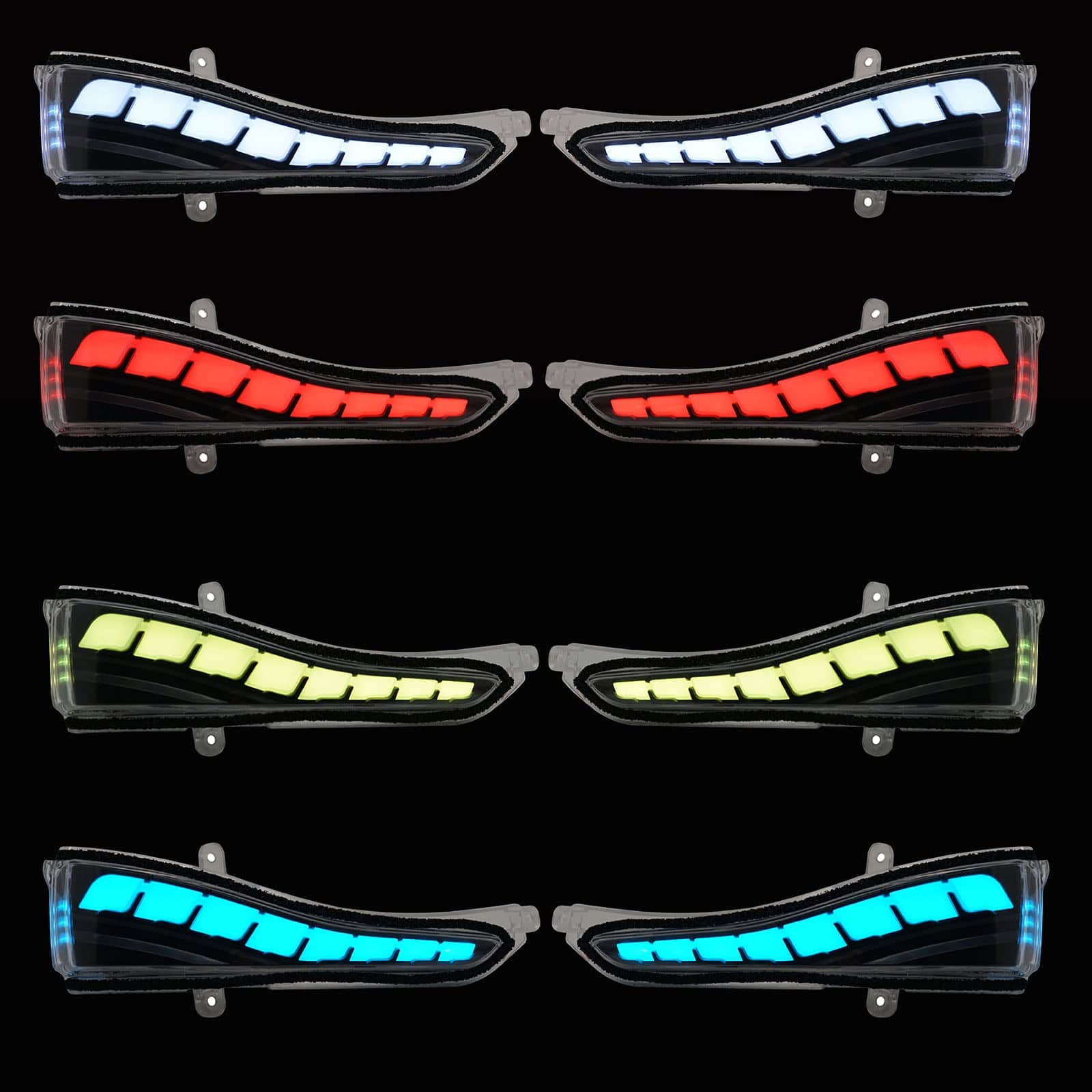 Este conjunto de espejos retrovisores con indicador de luz intermitente es compatible con varios modelos de Infiniti y Nissan, incluidos el Q50, Q60, Q70, QX30, QX50, QX60, QX70 y Skyline. Cuenta con luces LED selladas y resistentes al agua que sirven como señal de giro, luz de marcha y luz de paso de puerta. El diseño de colores mágicos RGB ofrece la capacidad de cambiar a cualquier color sólido, blanco puro o una variedad de patrones de colores en movimiento, con control de brillo y velocidad. Además, la luz de señal de giro LED cambia a color ámbar cuando el vehículo gira a la izquierda o a la derecha, con un efecto secuencial dinámico. La instalación de este conjunto no es plug & play y se recomienda una instalación profesional para aquellos que no estén familiarizados con los sistemas eléctricos de los automóviles modernos.