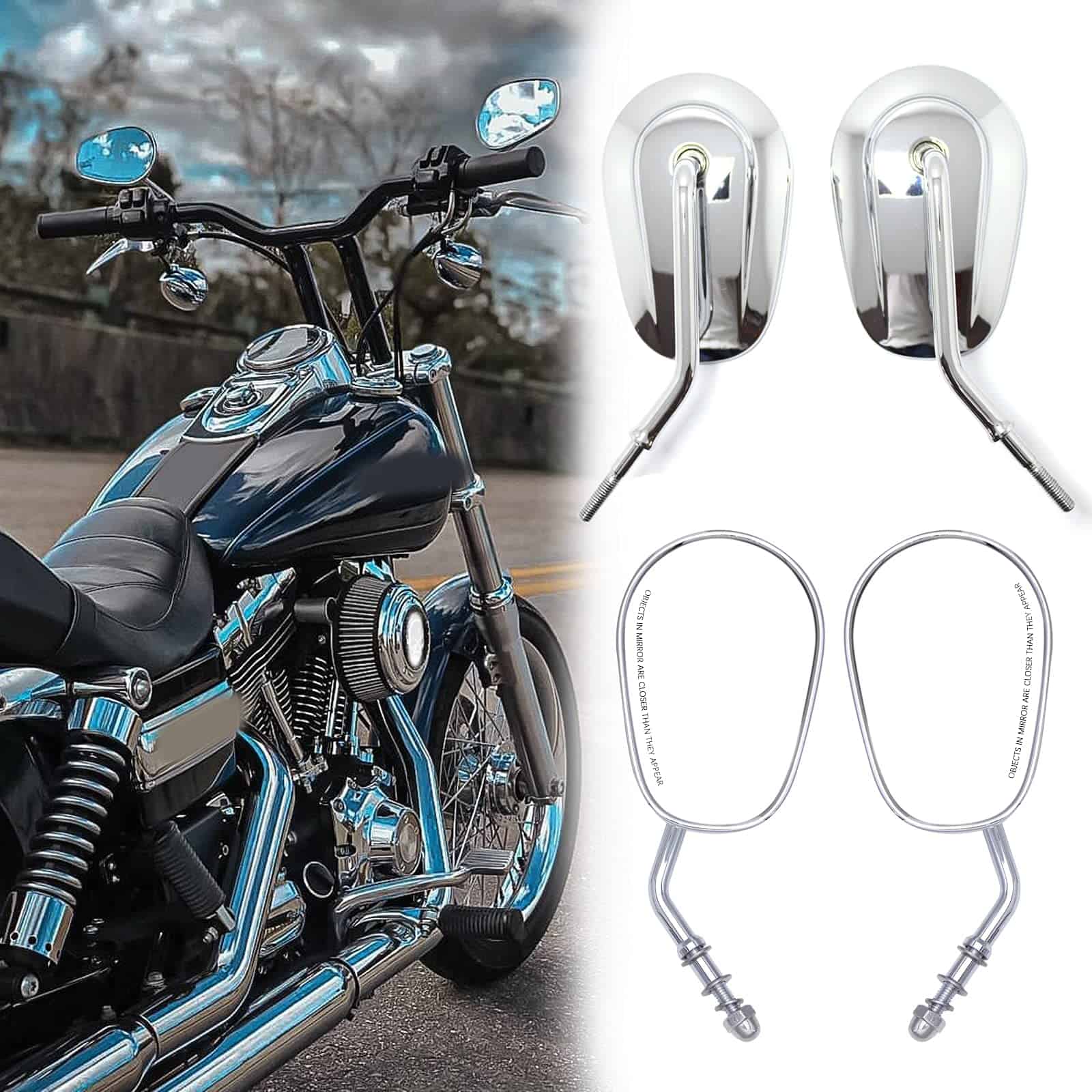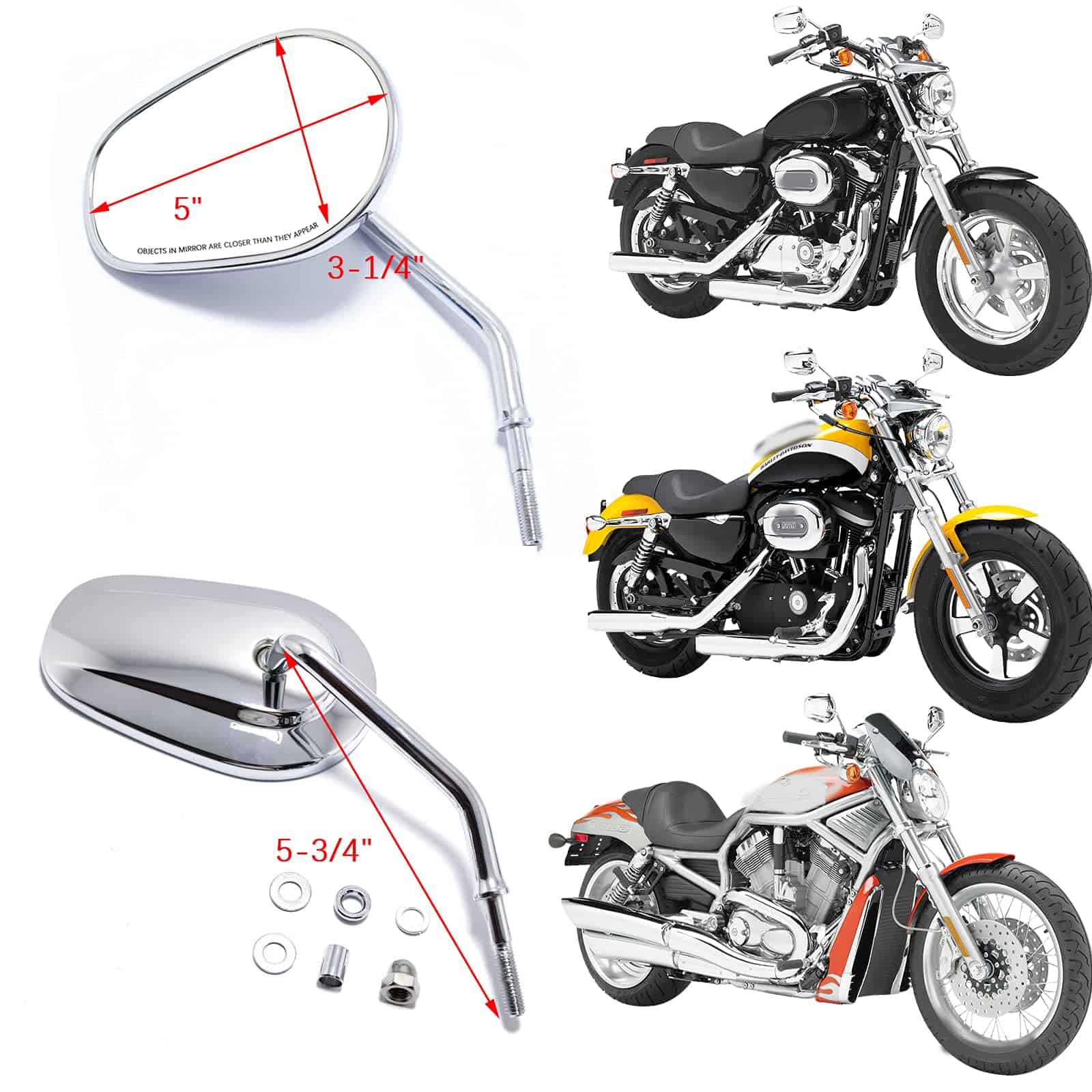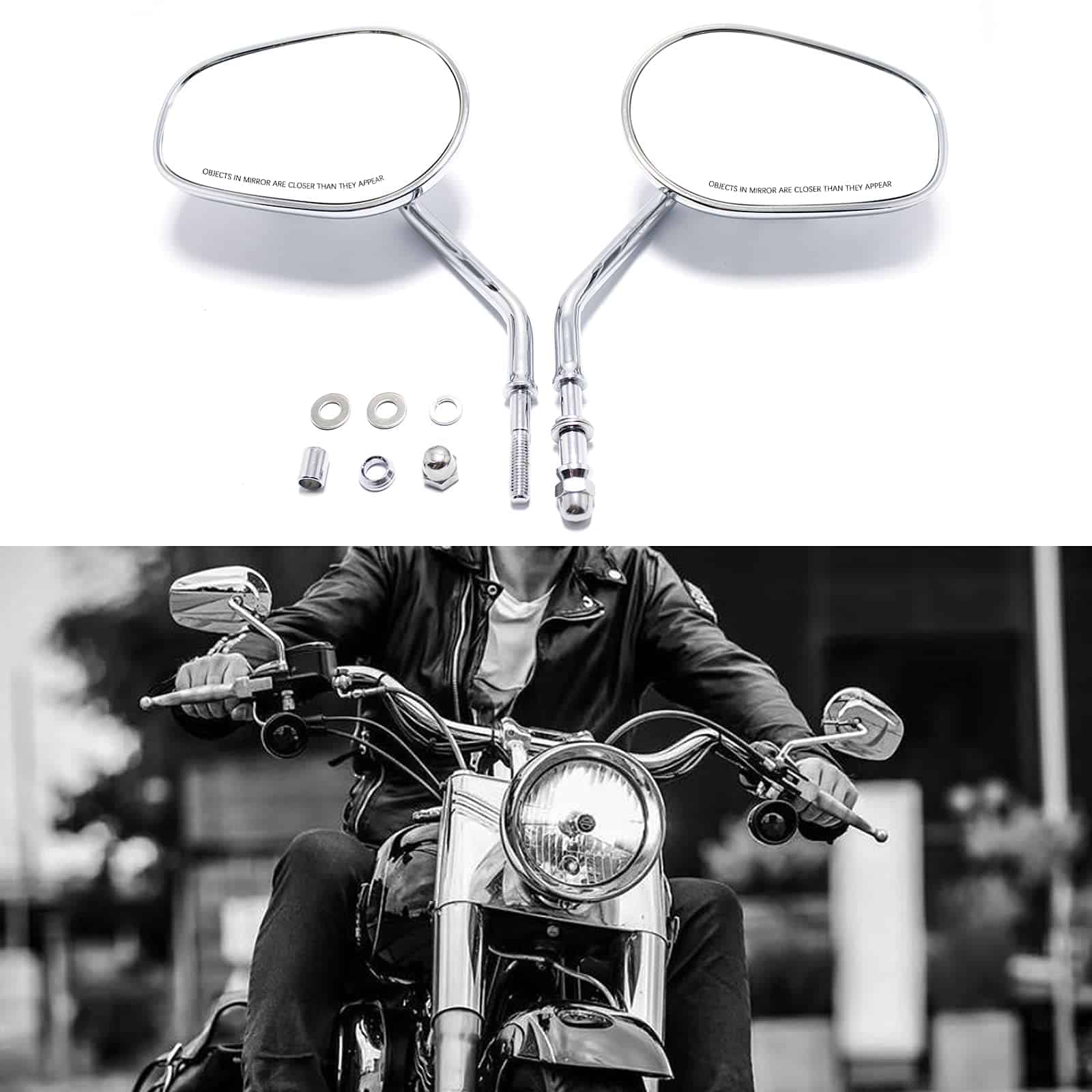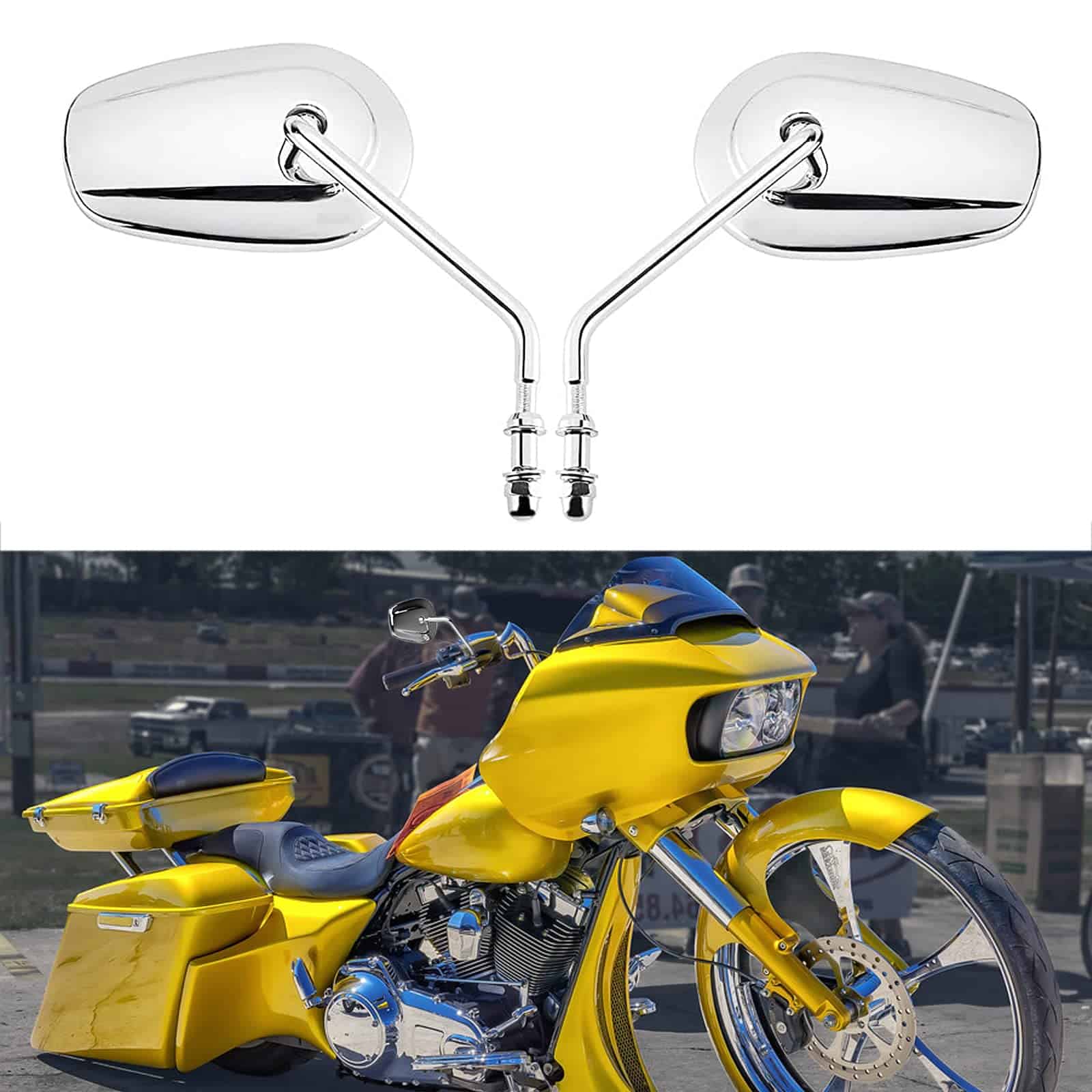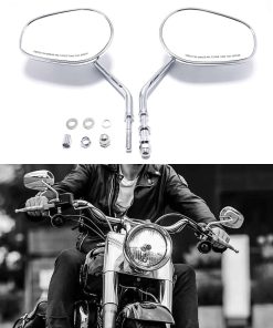 Espejos retrovisores laterales cromados de 8 mm para motocicletas Harley-Davidson. Su estructura de metal resistente con acabado cromado, lente de vidrio genuino y tallo de acero sólido los hace ideales para soportar impactos y resistir la corrosión, perfectos para todas las condiciones climáticas. Los espejos son ajustables, lo que permite cambiar el ángulo hacia arriba, hacia abajo, hacia la izquierda y hacia la derecha para una visión óptima. Con un tamaño de espejo de aproximadamente 127 mm x 83 mm y un tornillo de montaje de 8 mm, este par de espejos retrovisores universales es compatible con la mayoría de los modelos Harley Sportster, Softail, Dyna y Touring. Incluye un par de espejos retrovisores laterales para Harley Davidson.