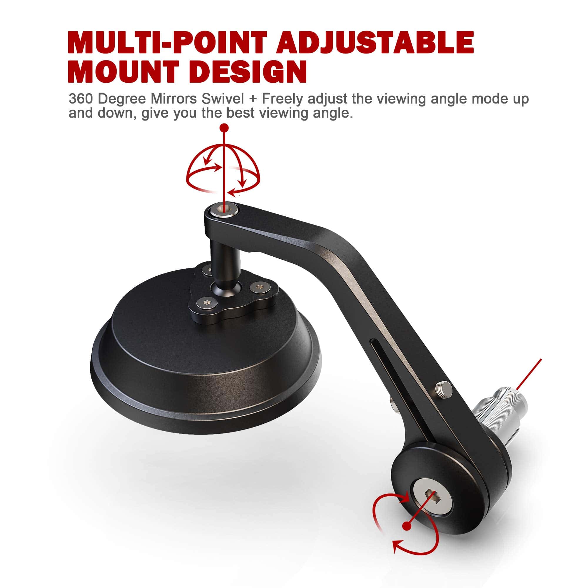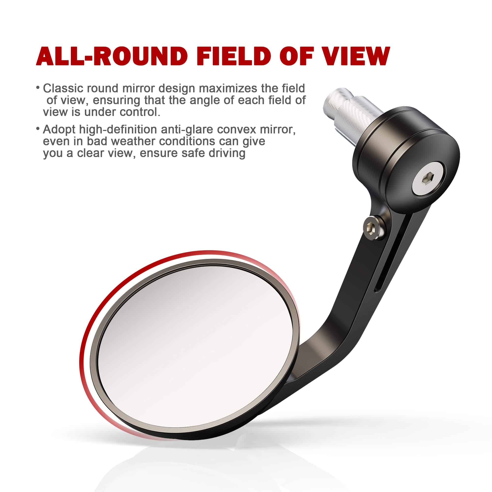 Especificación: Material: Aluminio Billet CNC y Acrílico de Grado Óptico con Espejo Convexo HD Diámetro del Espejo: 2,89 Pulgadas Longitud del Vástago: 5,11 Pulgadas Peso del Espejo: 0,97 Libras Pivot: ajustable 360 grados