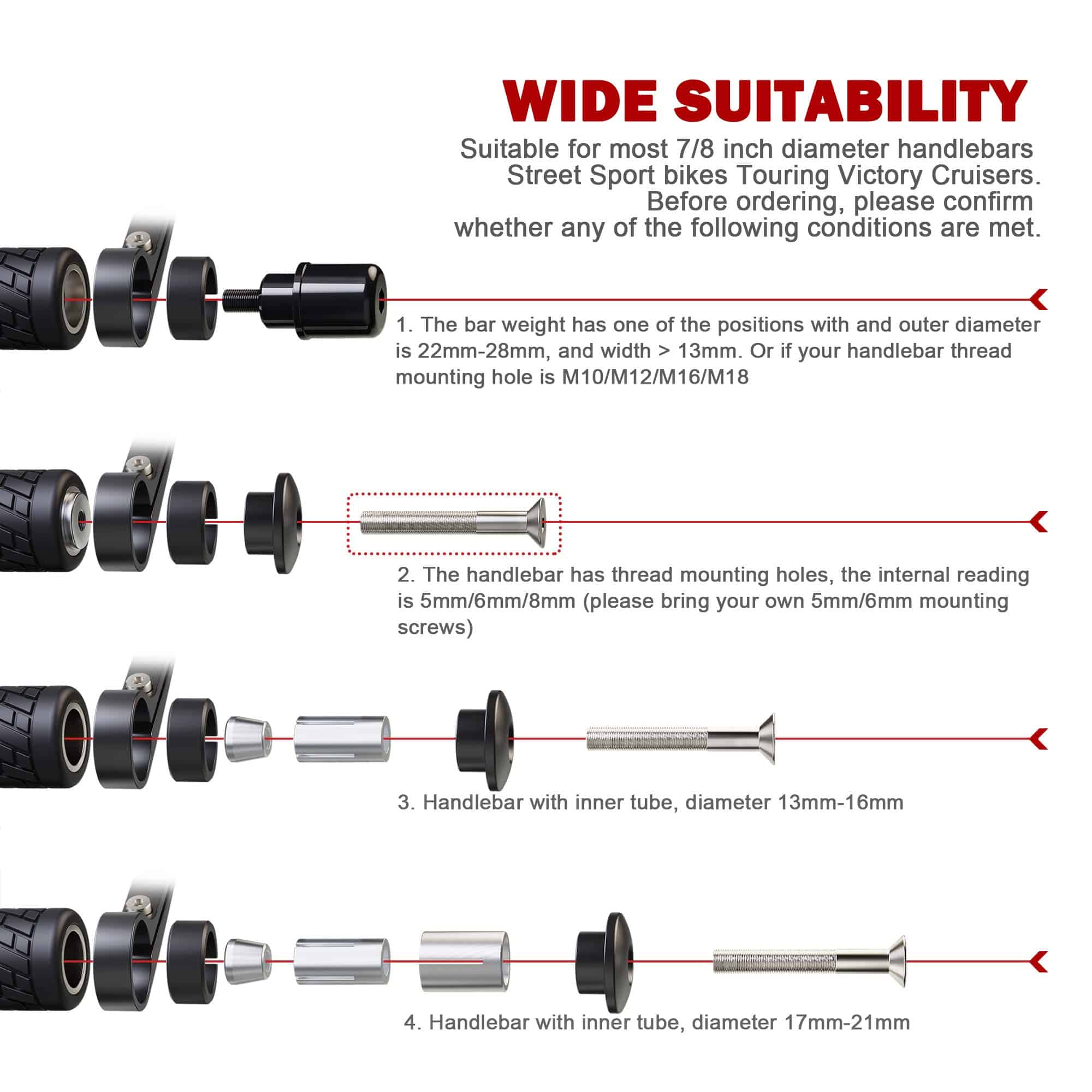Compatibilidad: Apto para la mayoría de las motocicletas, bicicletas de calle, bicicletas deportivas y scooters Cruiser con manillares huecos estándar de 7/8. NO es adecuado para manillares con rosca, SOLO PARA MANILLARES HUECOS ESTÁNDAR