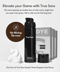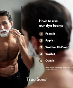 4. KIT DE TINTE PARA EL CABELLO CON UN REFUERZO DE TINTE: El kit de Tinte para el Cabello True Sons incluye una Espuma para Teñir el Cabello de 1.75 oz, 1 Refuerzo de Tinte, Guantes y una Guía de Inicio Rápido. Nuestro tinte para todo el cabello no solo es aplicable al cabello, sino que es un tinte para barba óptimo y se puede usar también para bigotes. Combinará perfectamente el color de todo tu vello corporal.