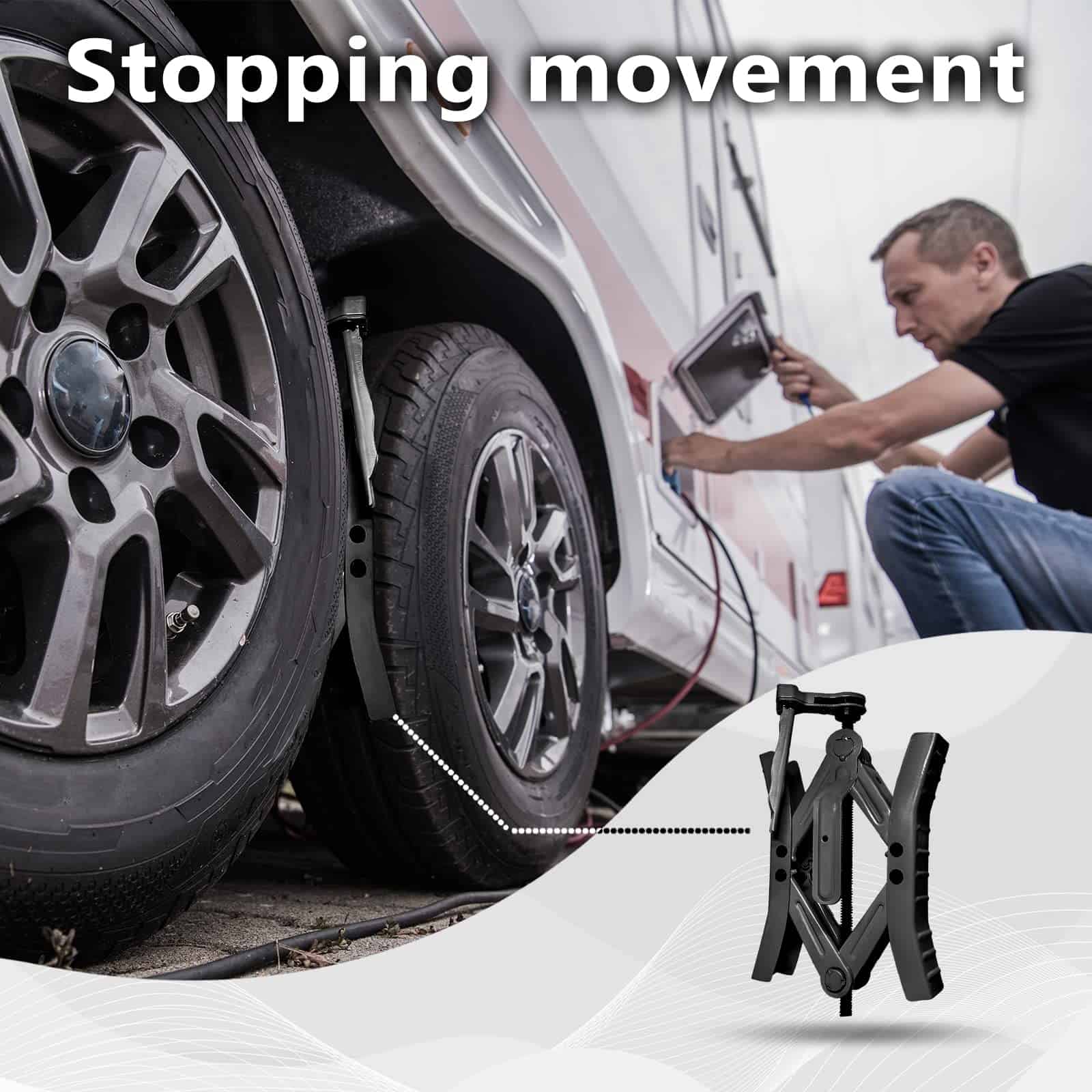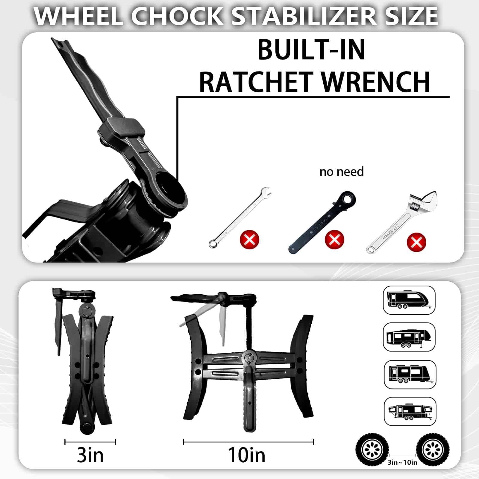 2. CONFIABLE-MÁS RÁPIDO: Nuestros estabilizadores de rueda para campistas vienen con una llave de trinquete plegable incorporada que rota 360 y también acciona ambos extremos del tornillo para que puedas abrir o retraer en 10 segundos! ¡No necesitas otras herramientas! Fácil de usar y ahorra espacio.