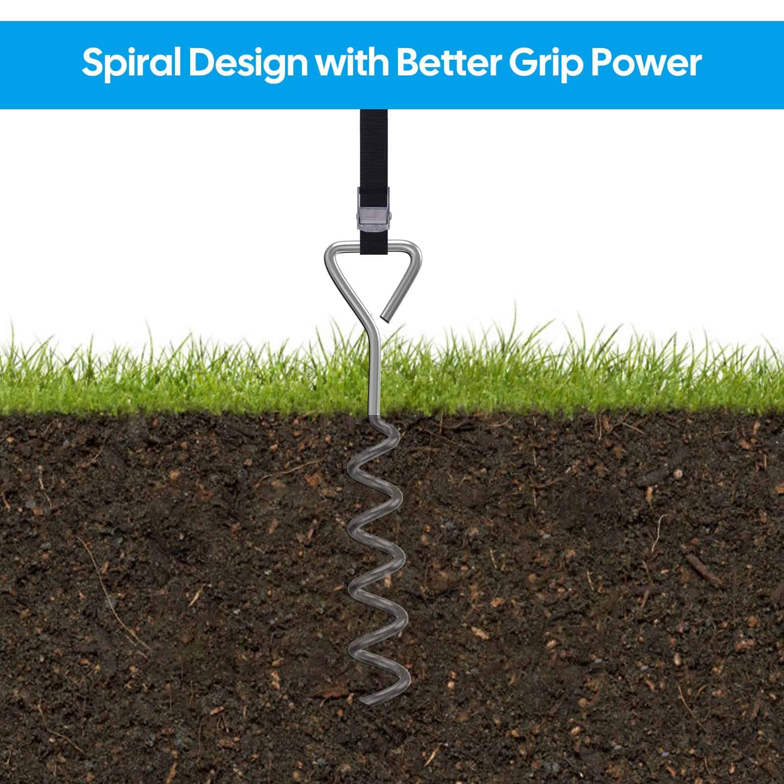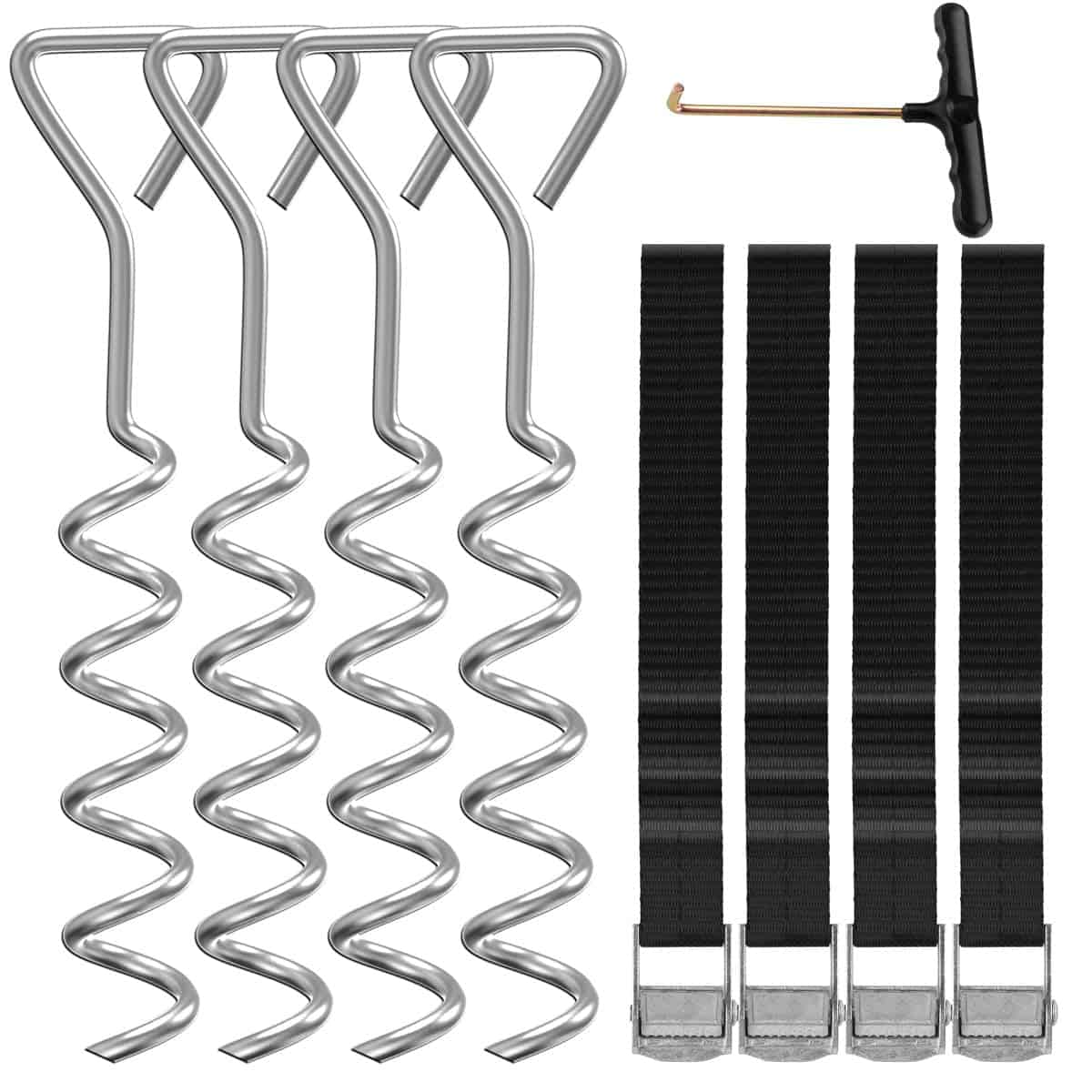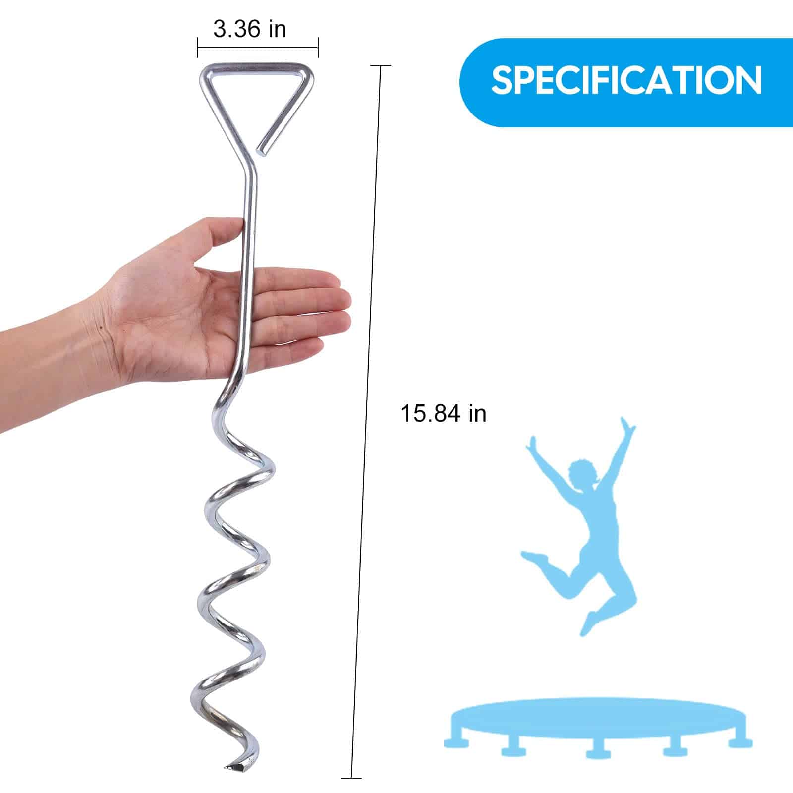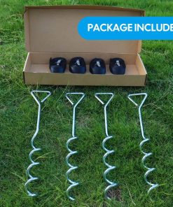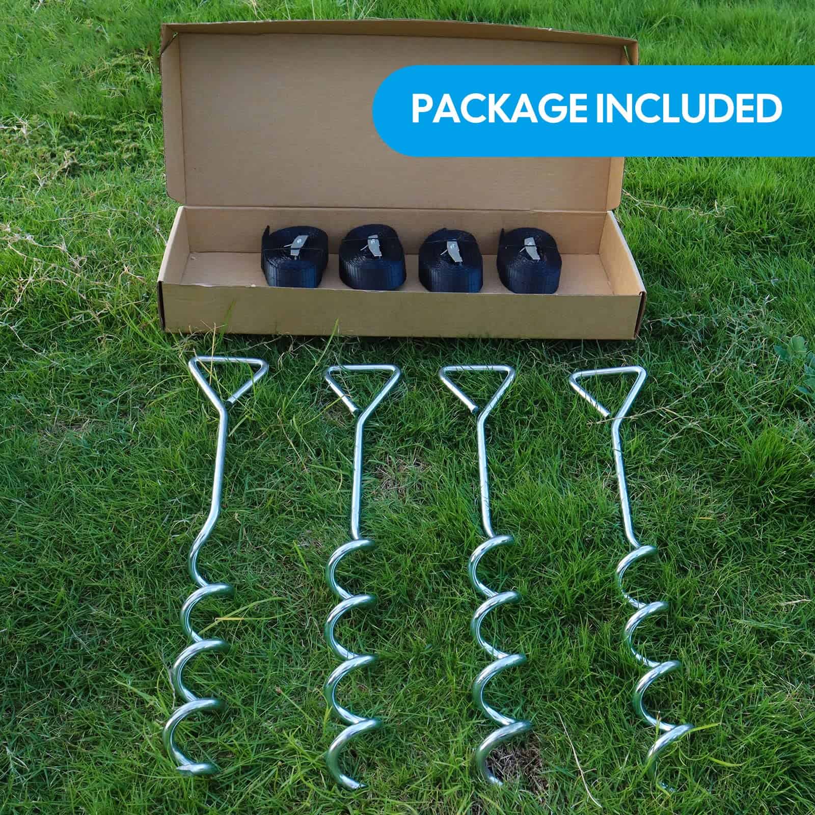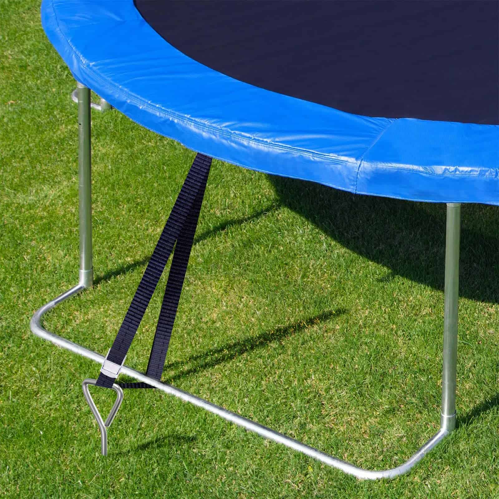 1. Incluye un juego de 4 estacas de trampolín de acero galvanizado en forma de sacacorchos y amarres para una fácil instalación.