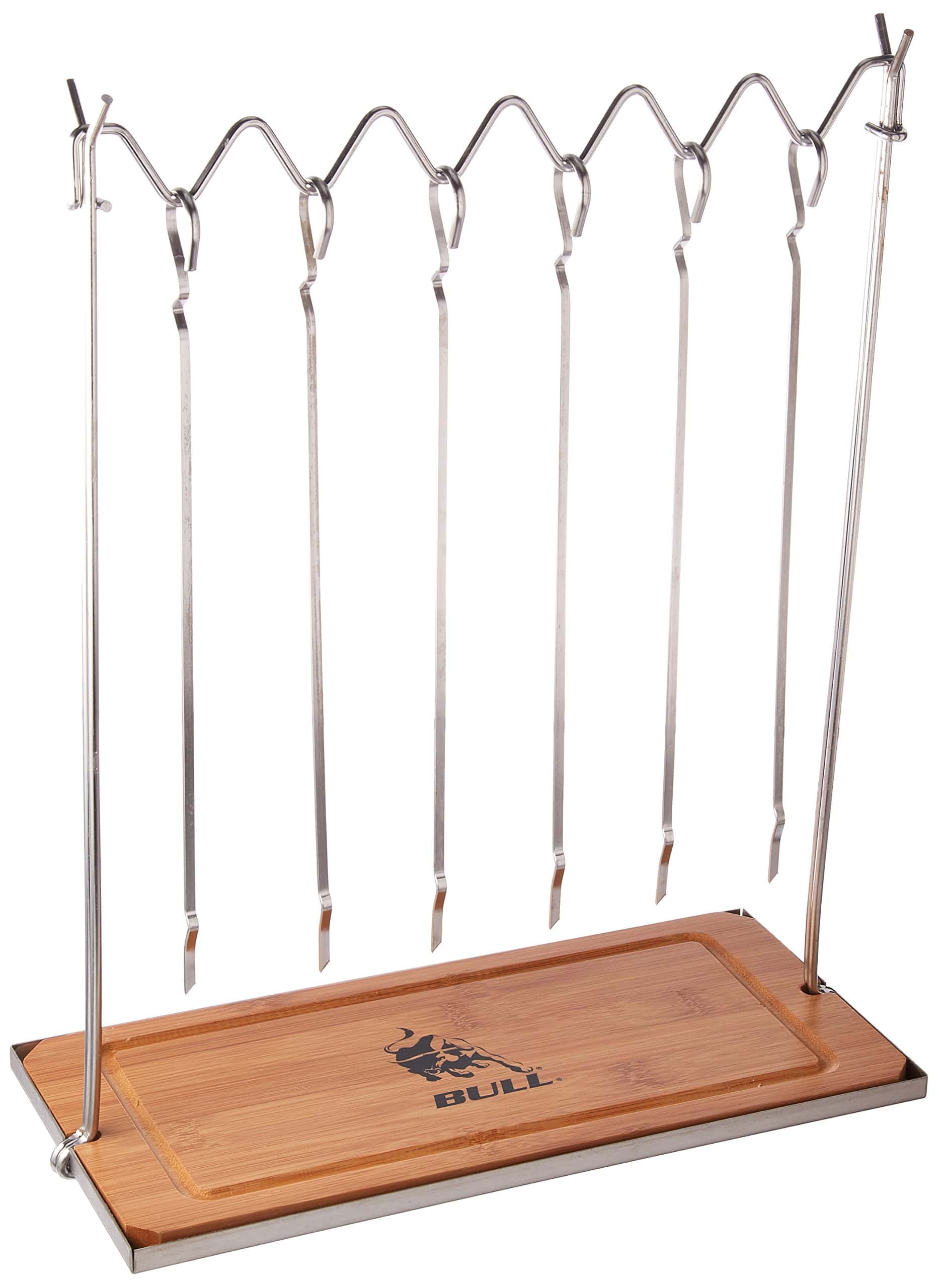Estación de Brochetas de Acero Inoxidable Bull Outdoor Products 24207. Incluye: 6 brochetas, 1 tenedor y 1 soporte. Base de madera removible. Forma emocionante de presentar sus carnes y vegetales asados en las comidas. Dimensiones: Altura Total – Arriba hacia Abajo: 16 pulgadas. Ancho Total – Lado a Lado: 6.5 pulgadas. Profundidad Total – Frente a Trasero: 4 pulgadas. Peso Total del Producto: 3 Libras.