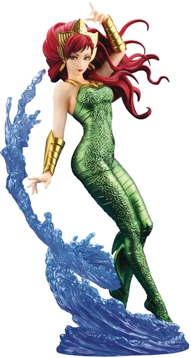 ¡Desde Kotobukiya! ¡La muy solicitada Mera finalmente se une a la serie Bishoujo! Mera es bellamente representada en el estilo Bishoujo por el ilustrador de la serie, Shunya Yamashita: ella muestra sus raíces atlantes con su pose elegante pero dinámica y su larga y brillante melena. ¡En las hábiles manos del escultor, Munchkin, la vida parece fluir en esta escultura hasta las puntas de sus dedos y cabello! El traje corporal de Mera ha sido recreado con una pintura iridiscente especial, y sus habilidades hidrocinéticas se muestran con la gran ola de agua que la rodea en la base, creando una escena dramática. ¡Asegúrate de añadir esta figura que encapsula perfectamente todo sobre Mera como personaje a tu colección!