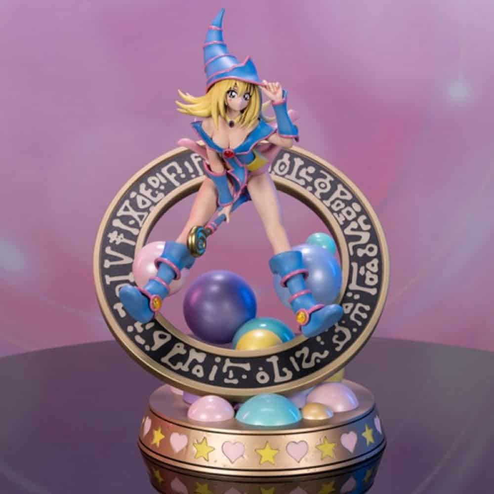 Estatua de PVC de Dark Magician Girl Pose única inspirada en la ilustración de las cartas de intercambio Detalles intrincados en el Sello de los Magos, orbes mágicos y base Dos (2) funciones de iluminación LED (Estática y Animada) para el Sello del mago Caja de lujo premium Numeración de edición limitada Tarjeta de autenticación