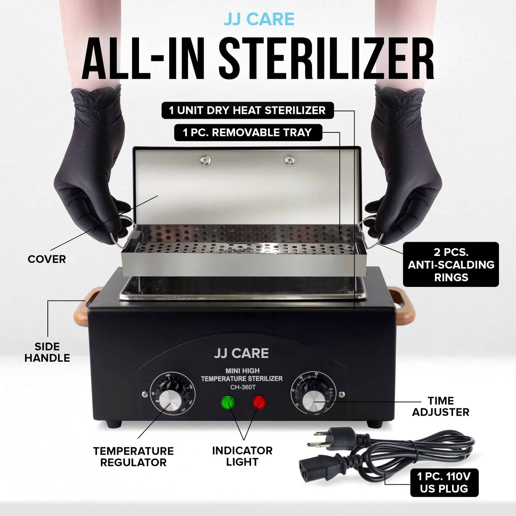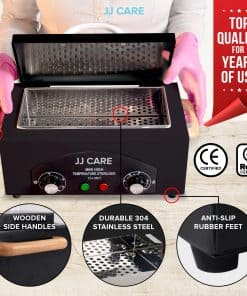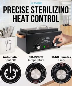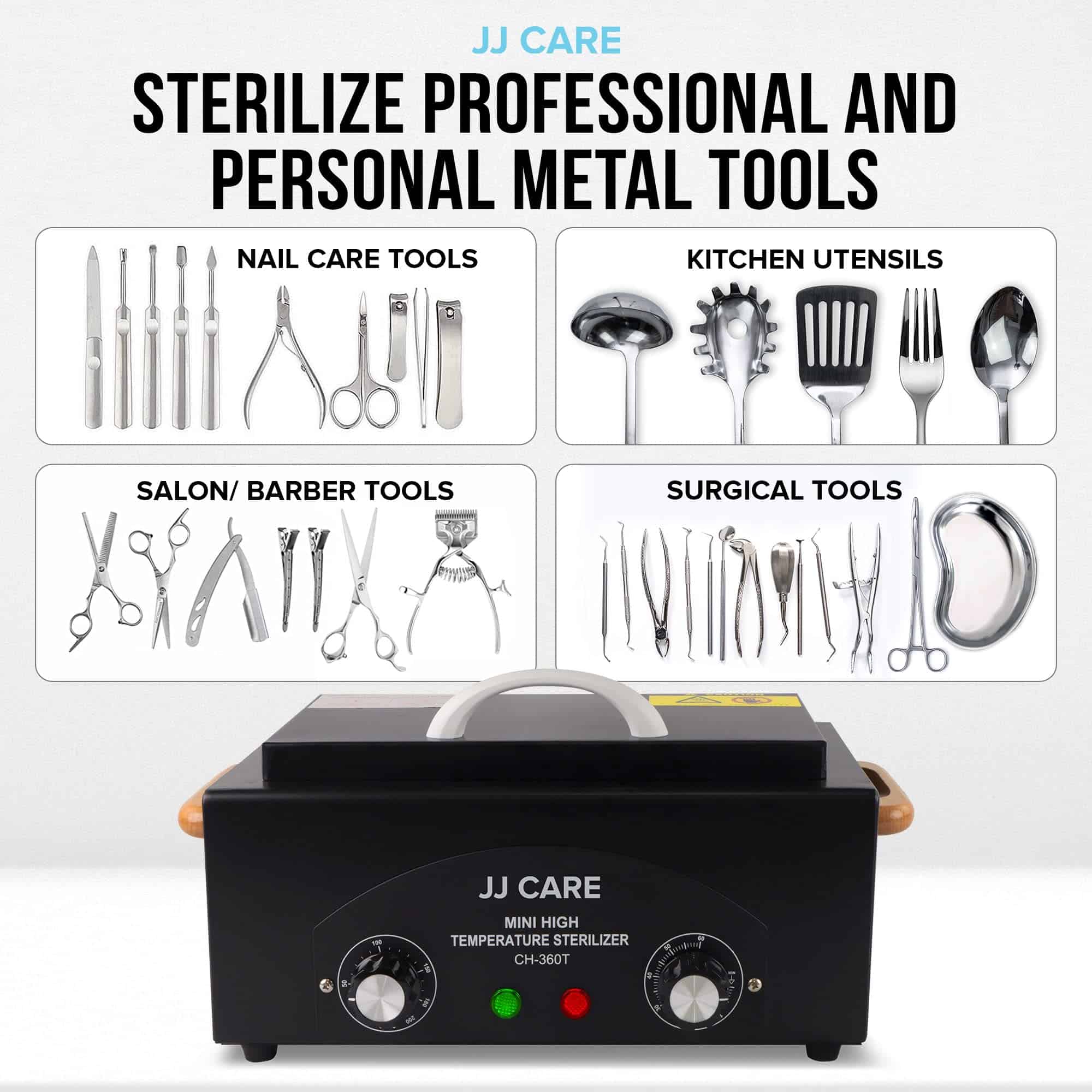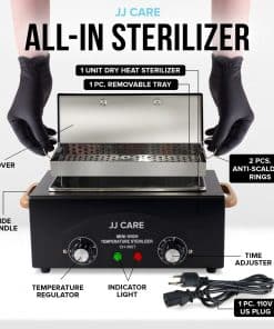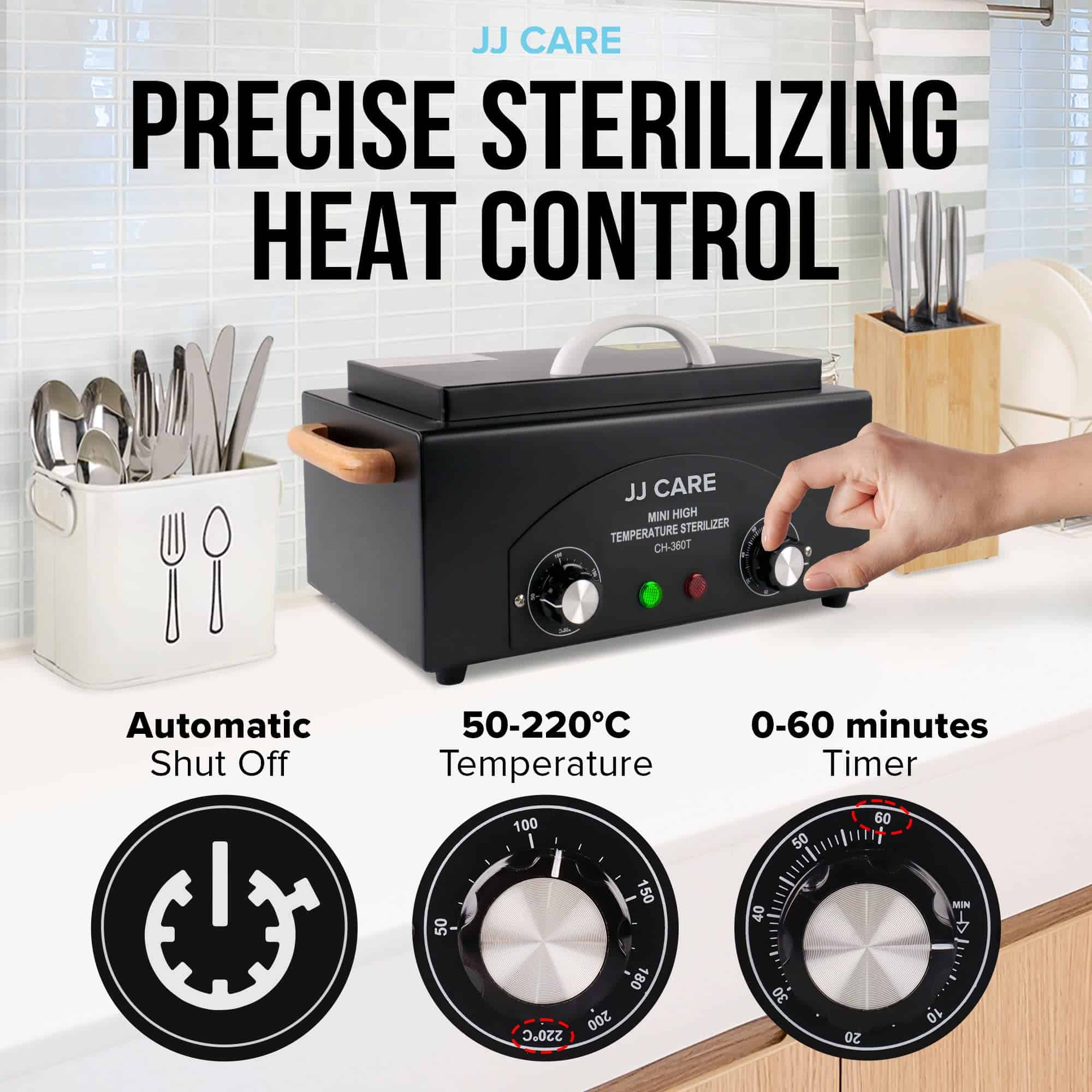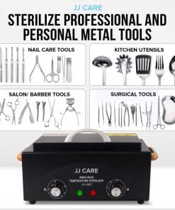 La caja esterilizadora JJ CARE utiliza calor seco de alta temperatura de hasta 200 °C para esterilizar herramientas de pelo personales o profesionales hechas de metal. Limpia y esteriliza de manera efectiva, no se necesitan químicos y no involucra rayos dañinos. Este esterilizador de alta temperatura para suministros de saneamiento de uñas es fácil de operar. Después de colocar los elementos dentro de la caja, ajuste el dial de potencia/temporizador seguido del dial de temperatura. El tiempo de esterilización solo toma alrededor de 15 minutos a 125 °C.