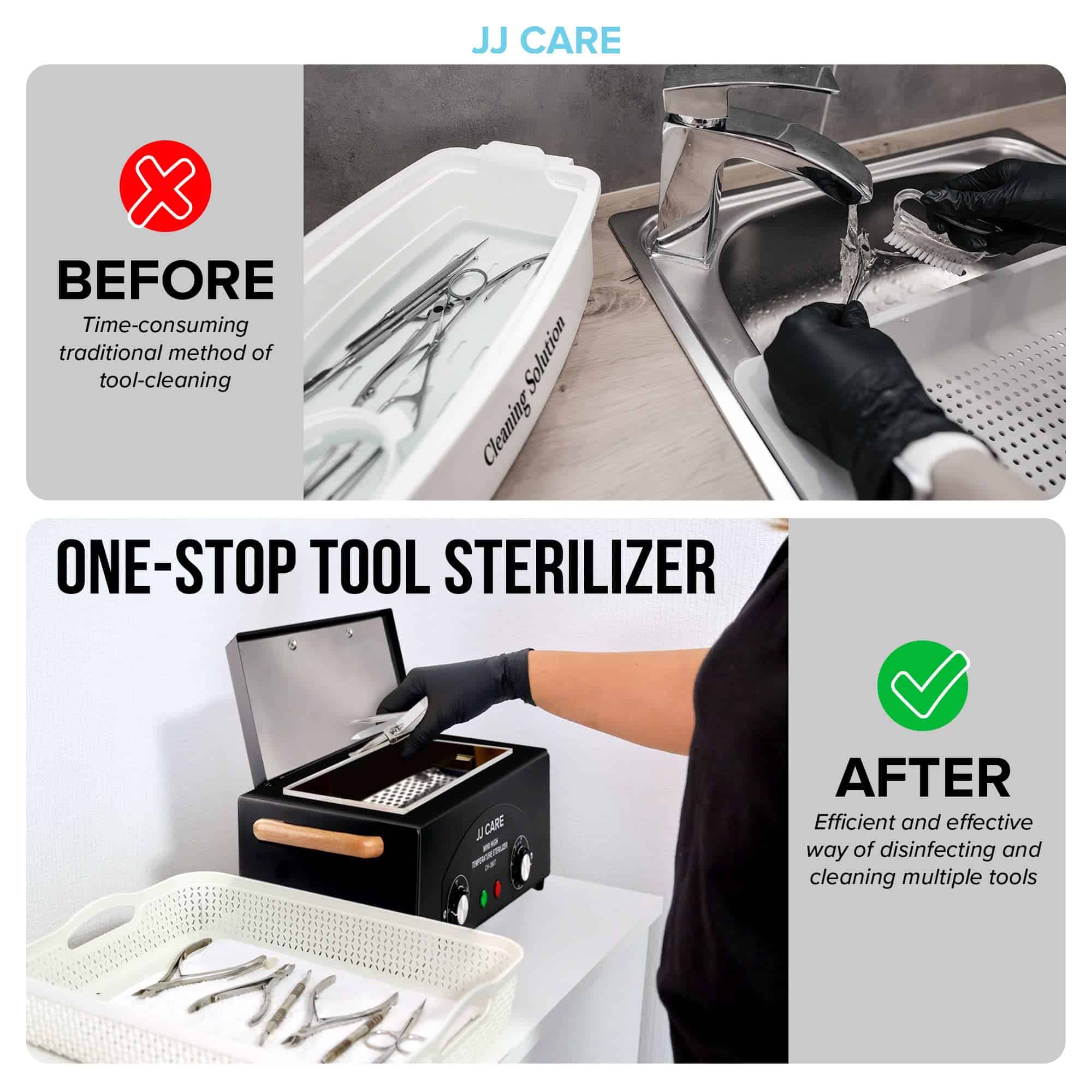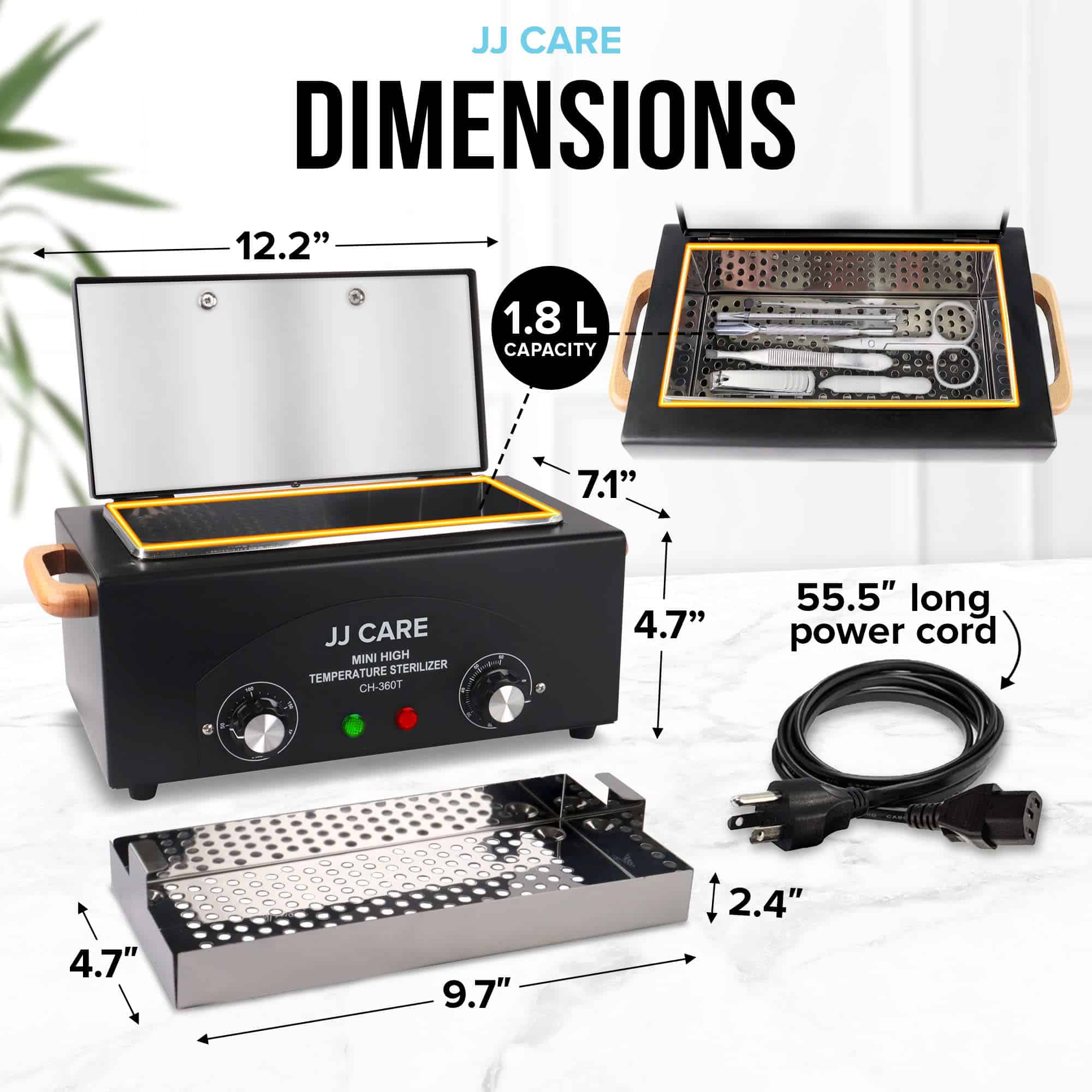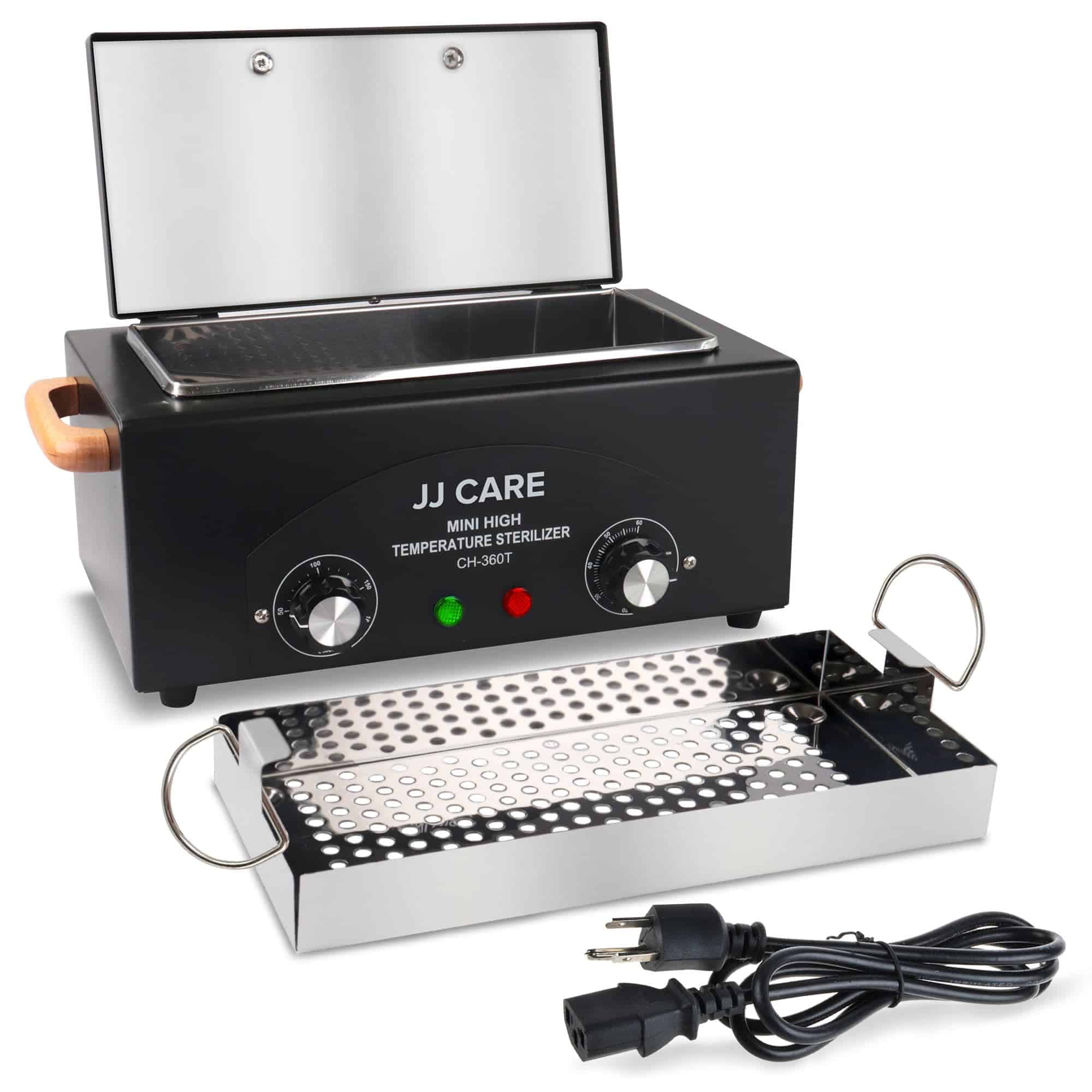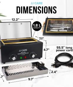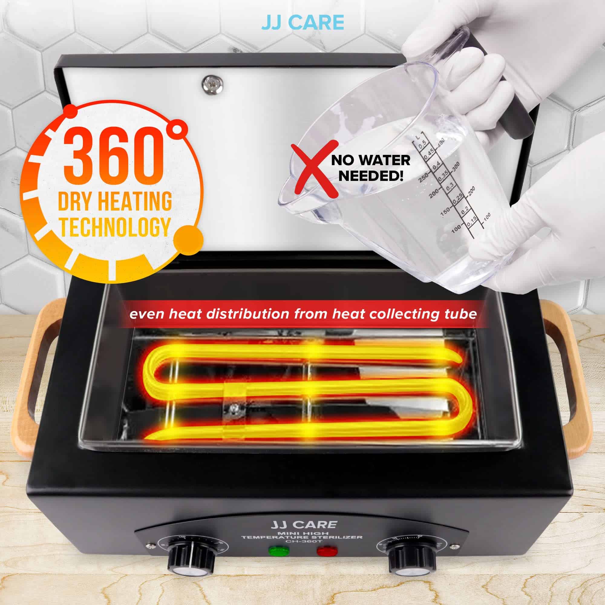 La caja esterilizadora JJ CARE utiliza calor seco de alta temperatura de hasta 200 °C para esterilizar herramientas de pelo personales o profesionales hechas de metal. Limpia y esteriliza de manera efectiva, no se necesitan químicos y no involucra rayos dañinos. Este esterilizador de alta temperatura para suministros de saneamiento de uñas es fácil de operar. Después de colocar los elementos dentro de la caja, ajuste el dial de potencia/temporizador seguido del dial de temperatura. El tiempo de esterilización solo toma alrededor de 15 minutos a 125 °C.