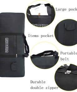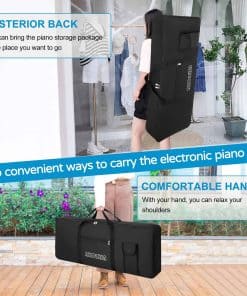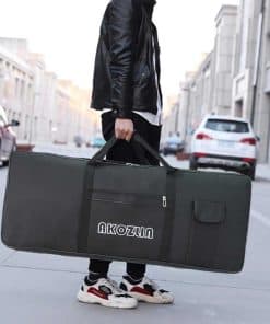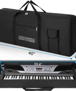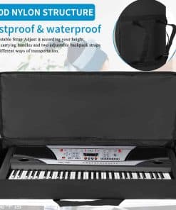Estuche acolchado portátil para teclado de 61 teclas AKOZLIN, Dimensiones 40’X6’X16′, Bolsa de transporte para teclado eléctrico en color negro. Este estuche duradero está diseñado específicamente para teclados de 61 teclas, con una construcción resistente de nylon 600D que protege su instrumento de golpes y daños durante el transporte. La parte acolchada con algodón perla en el interior asegura una protección adicional para su piano eléctrico. Además, la bolsa de teclado es a prueba de polvo e impermeable, con materiales nuevos que garantizan la seguridad de su teclado. Con correas ajustables para mayor comodidad, 2 asas de transporte y 2 correas de mochila le brindan diferentes opciones de transporte. Es el regalo perfecto para los amantes del piano eléctrico, permitiéndoles llevar su teclado a todas partes y disfrutar de la música en cualquier momento. ¡Lleva la magia de la música contigo con este estuche de teclado de alta calidad!