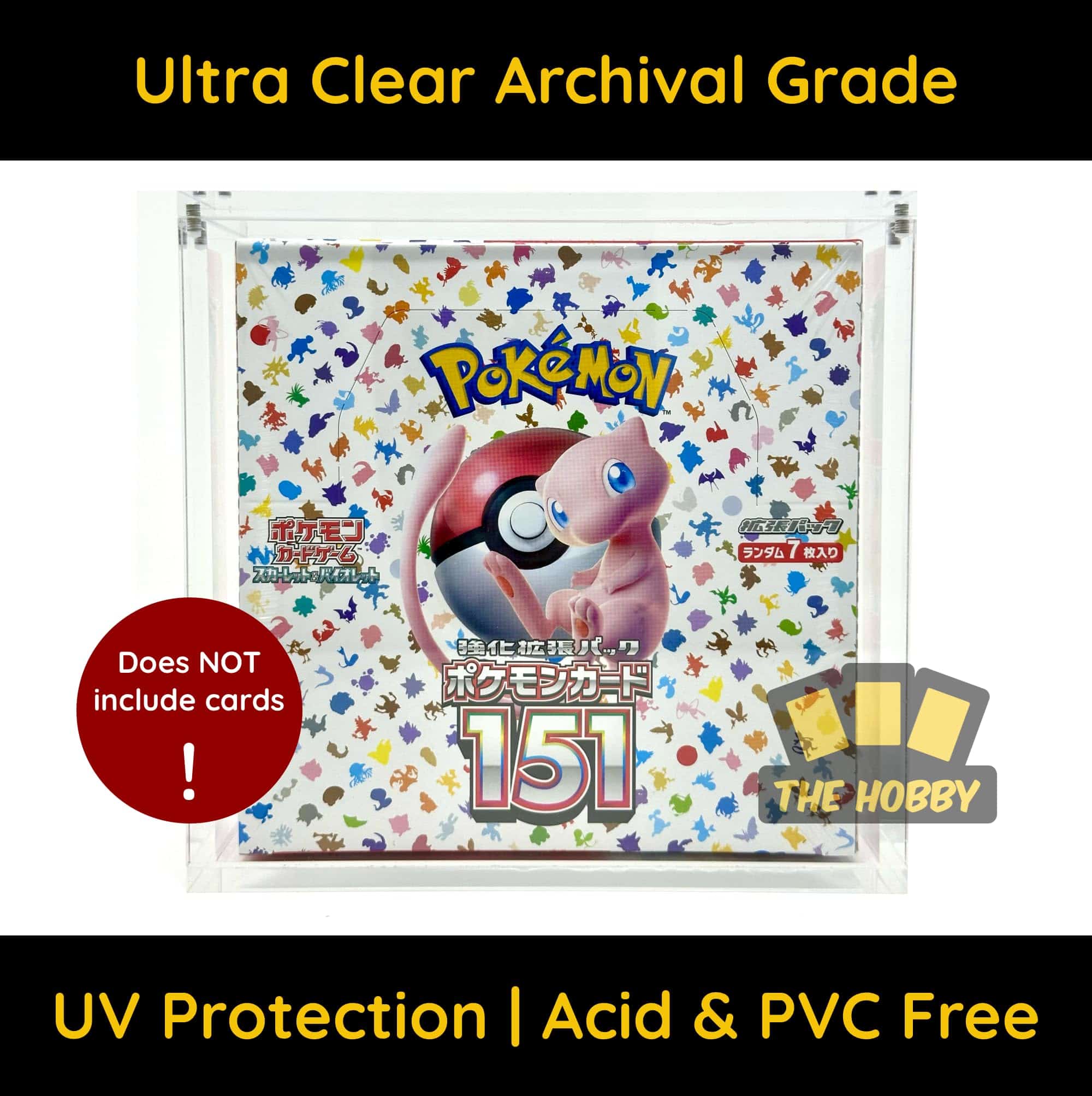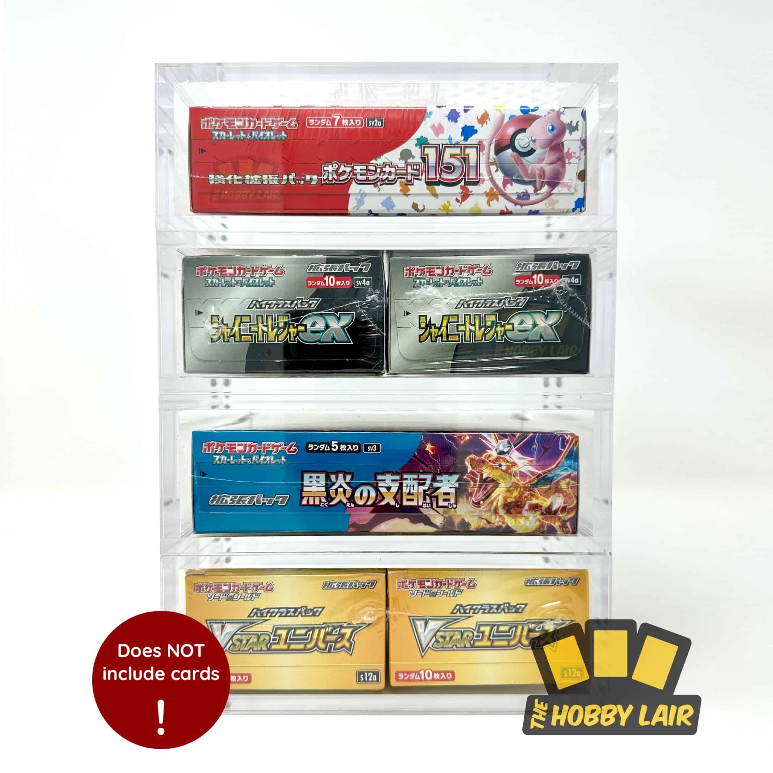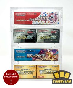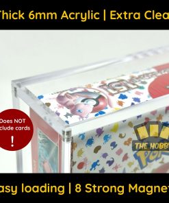 2X ESTUCHE DE ACRÍLICO PREMIUM SOLAMENTE. ¡LAS CARTAS DE POKÉMON NO ESTÁN INCLUIDAS! Muestra y protege tus Cajas de Cartas de Pokémon Japonesas en estuches de acrílico protegidos contra los rayos UV. El estuche de acrílico ultra claro y grueso cuenta con un diseño de apertura superior de 2 piezas con 8 imanes de alta resistencia adicionales. Cada exhibidor incluye accesorios opcionales de pies de goma y un paño de limpieza. Hecho con materiales sin PVC y libres de ácido para una protección premium. NOTA: El pegamento de alta resistencia puede tener olor durante unas horas después de abrirlo, esto se desarrolla de forma natural durante el proceso de curado y no es dañino ni tóxico. Se adapta a Cajas de Boosters de tamaño estándar japonés de Pokémon XY, Sol y Luna, Espada y Escudo, y las Series Escarlata y Violeta, incluidas las cajas de Boosters de Alta Clase.