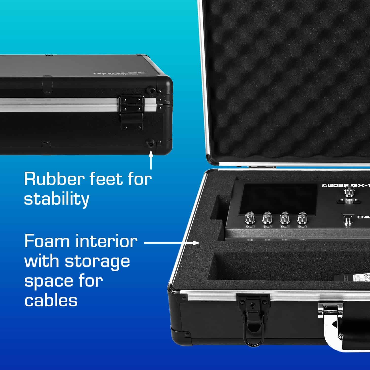 1. Espuma troquelada a medida para adaptarse a las dimensiones del Boss GX-100. 2. Exterior duradero y ligero. 3. Pestillos metálicos; se pueden cerrar con llave para mayor seguridad (se incluyen 2 llaves). 4. Mango cómodo y ergonómico. 5. Dimensiones exteriores: 24.21 x 15.94 x 7.48 pulgadas