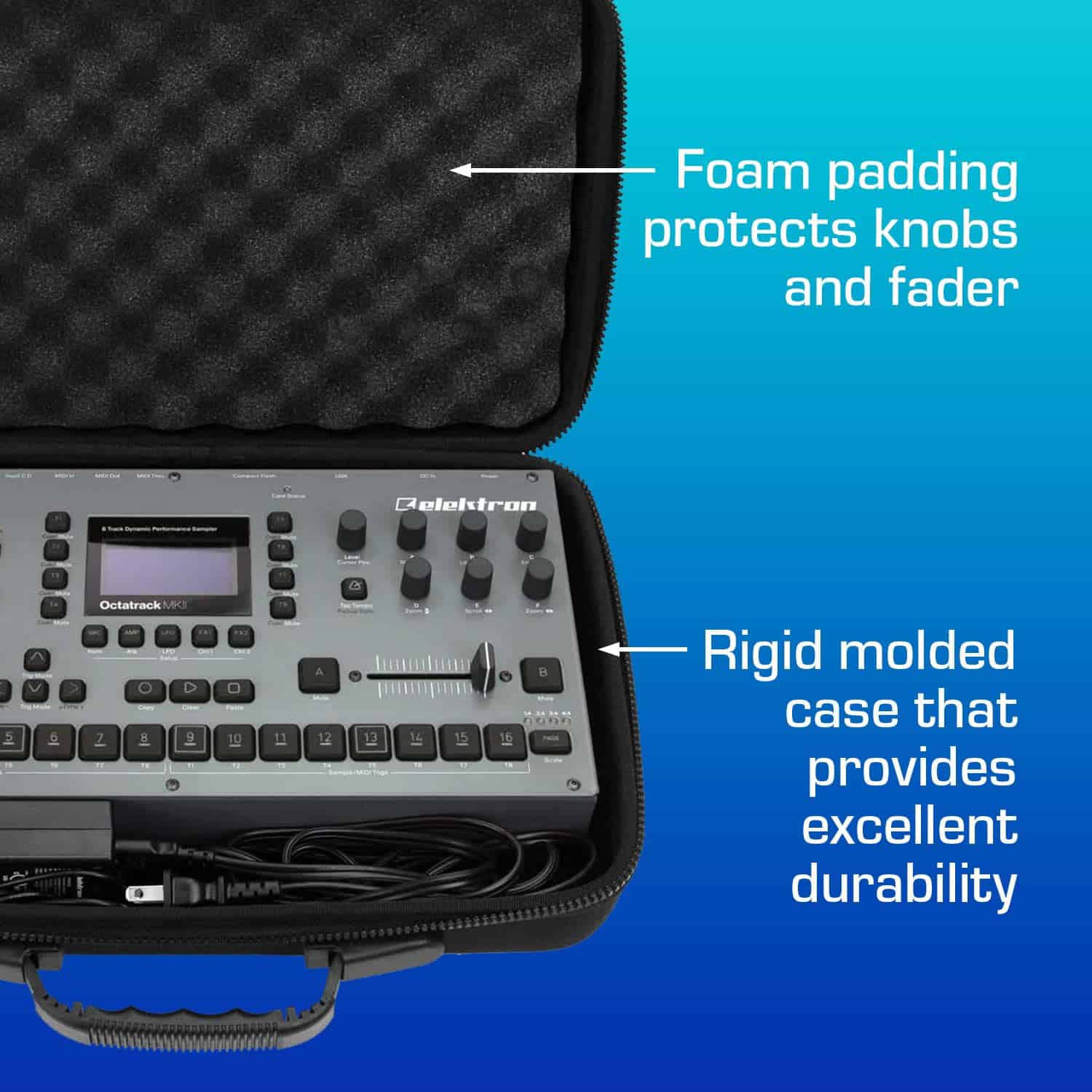 ¡Protege tu Octatrack! El Elektron Octatrack es una de las máquinas más importantes e icónicas para interpretar música electrónica en vivo. Si giras o actúas en vivo con tu Octatrack, hemos creado este estuche especialmente para ti. Este estuche PULSE está diseñado a medida para el Octatrack. Está moldeado a la longitud exacta de la máquina, pero también hemos incluido espacio adicional para sostener tu cable de alimentación. La tapa superior del estuche incluye una capa de espuma esponjosa densa, para proteger el delicado fader y los botones de tu máquina. El cuerpo del estuche está reforzado con espuma de EVA moldeada extra gruesa, para resistir las exigencias del camino. Ya sea que empacar este estuche dentro de una maleta o transportarlo usando el asa espaciosa y cómoda, es la solución ligera perfecta para mantener tu máquina en excelente estado. Como ventaja adicional, este estuche también se puede usar para el Analog Rytm MK1 o Analog Four MKI.