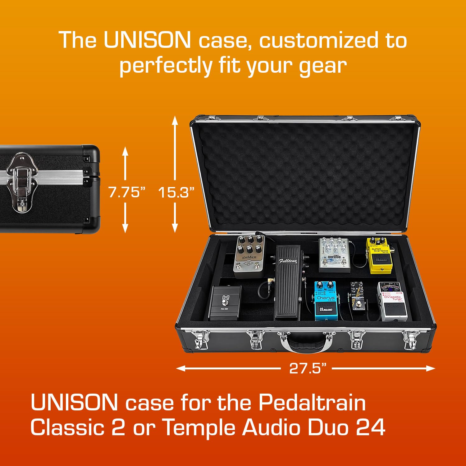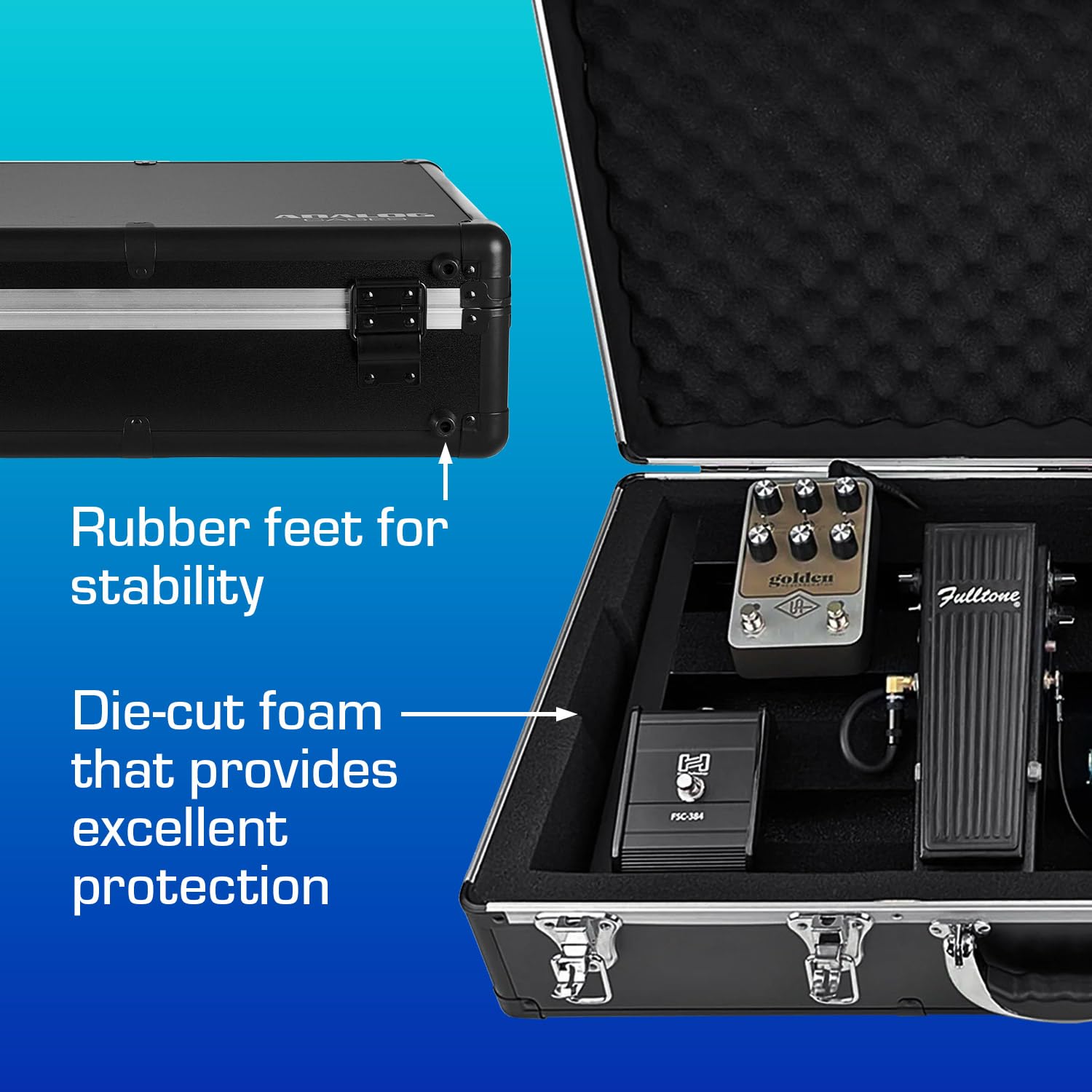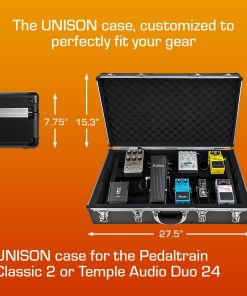 El estuche ANALOG CASES Pedaltrain Classic 2 / Classic 1 / Temple Audio DUO 24 es la solución perfecta para transportar tus pedales de efectos de manera segura y cómoda. Fabricado con materiales de alta calidad, este estuche ultra ligero ofrece una protección excepcional para tus equipos. Su inserto de espuma personalizado asegura que tus pedales se mantengan en su lugar durante el transporte, evitando daños. Además, su asa acolchada y hebillas metálicas garantizan un manejo fácil y seguro. Diseñado por el equipo de Analog Cases en los Estados Unidos, este estuche es parte de la amplia gama de soluciones de transporte que ofrece la marca para músicos y productores. Con dimensiones exteriores de 27.50 x 15.30 x 7.75 pulgadas y un peso de 12.15 libras, este estuche es ideal para músicos en movimiento que buscan proteger sus pedales con estilo y comodidad.